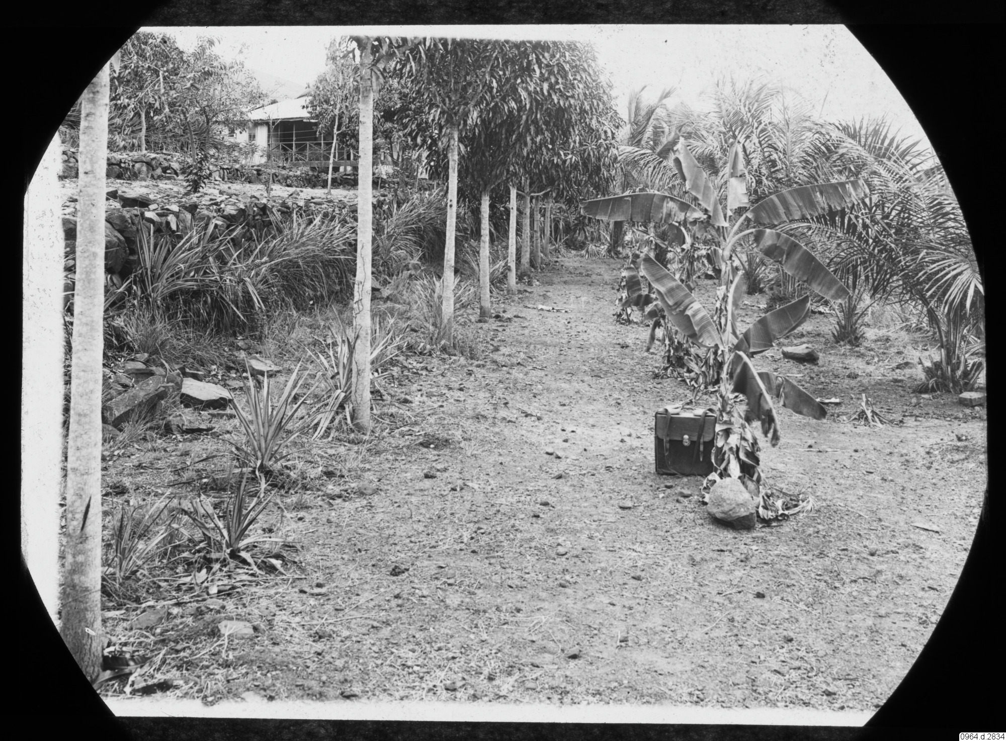 byggnad, växter, väska, bananträd, palmer, stolpar, fotografi, photograph