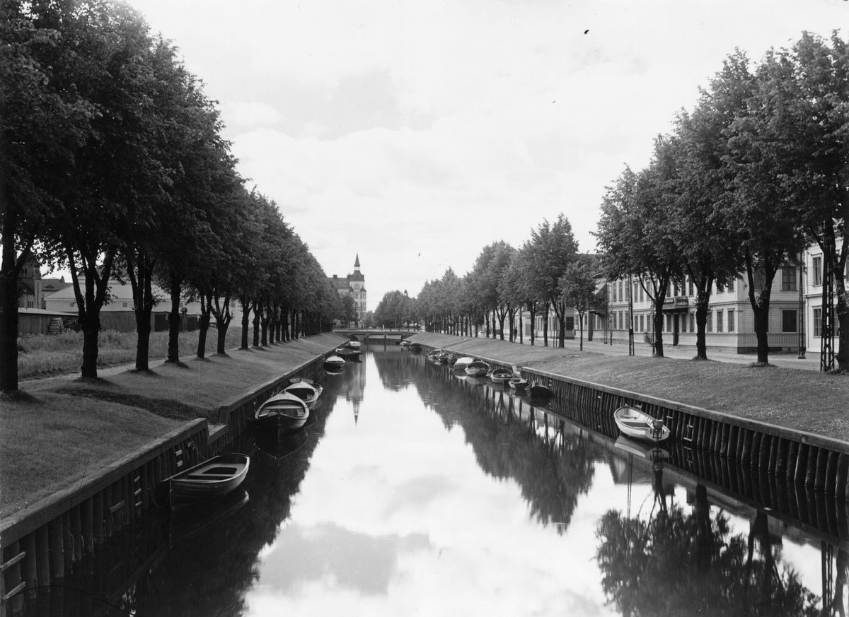 Titel: Parti av Östra Lillån. I bakgrunden syns tornet till Bellanderska fastigheten, kvarter Armfelt, vid slutet av Nygatan.