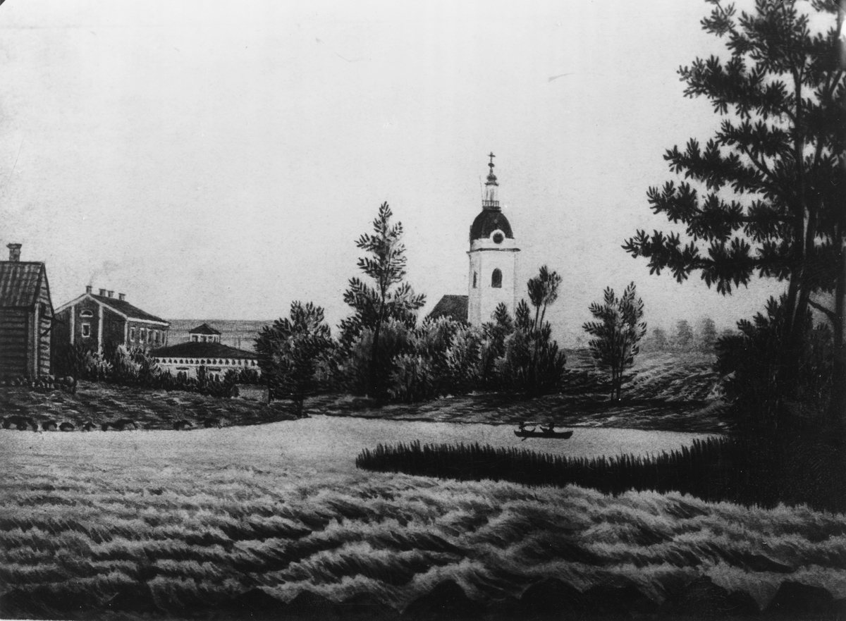 Heliga Trefaldighets kyrka från nordväst. Akvarell omkring 1845.