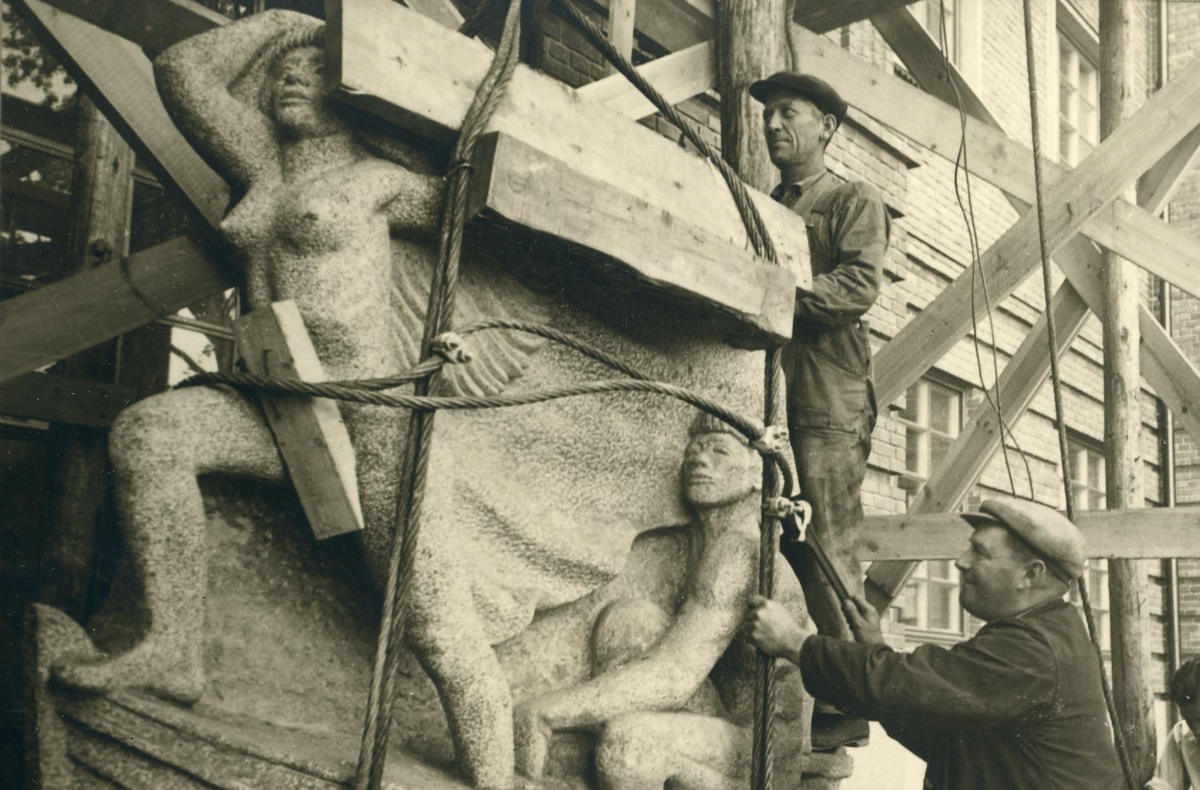 Reliefen "Snöfrid" monteras på plats. Bild tagen i samband med arbetet att uppföra Gävle Museum åren 1938-40.
