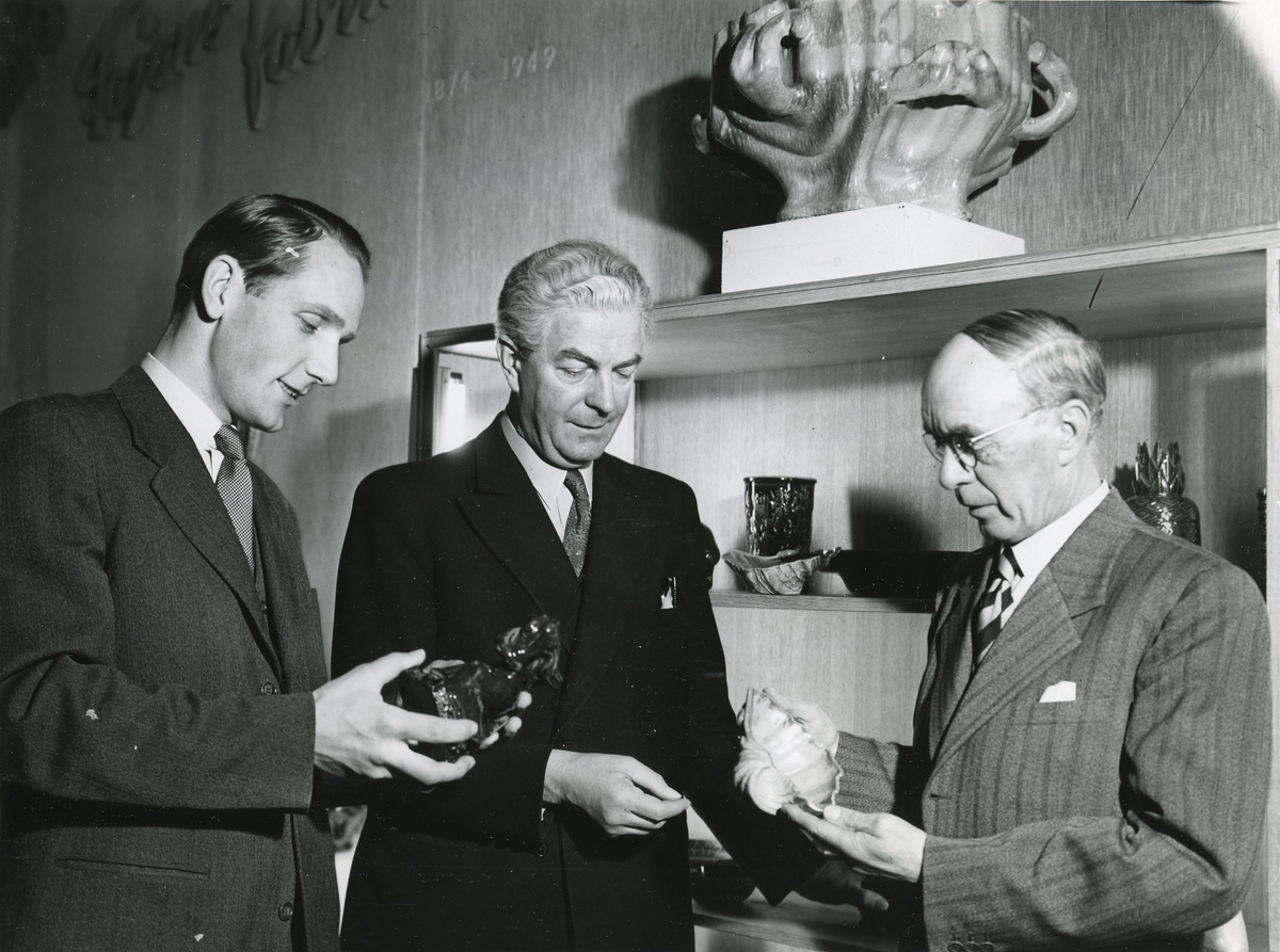 Bo Fajans 75 år, retrospektiv utställning med keramiska föremål, Gefle Museeum 18/11 - 5/12 1949. Från vänster i bild: okänd man, Evald Dahlskog och Gösta Boberg.