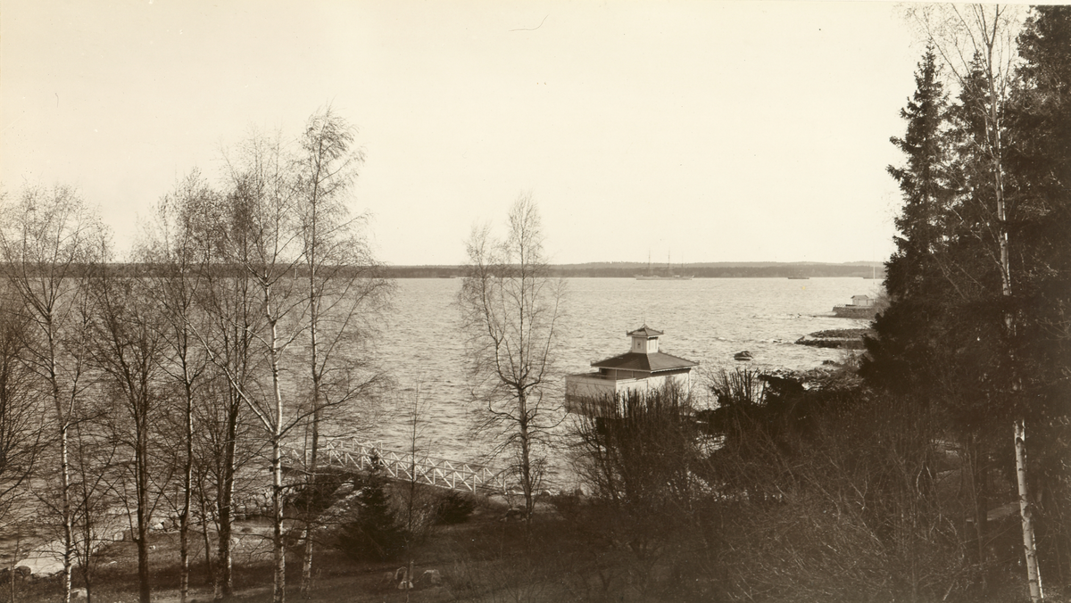 Bilder av släkten Brodin från hemmet på Norrlandet, brygga och badhus syns vid vattnet.
