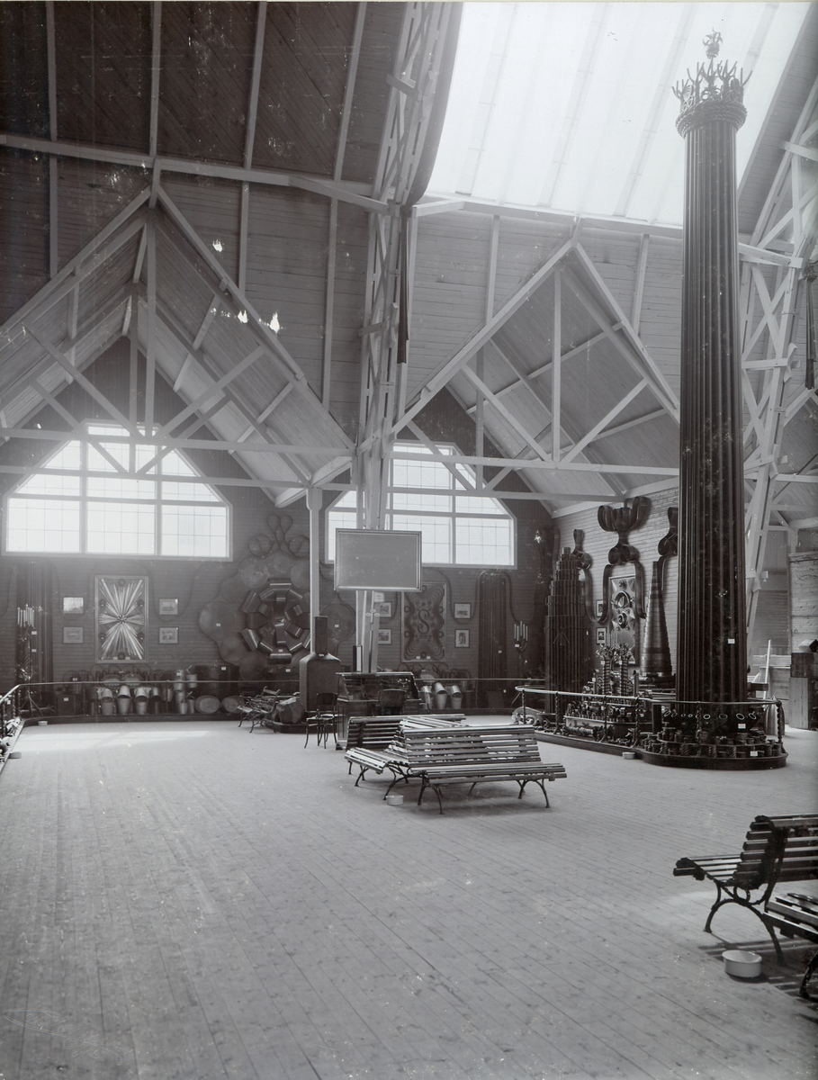 Gefle-utställningen 1901. En Lantbruks-, industri- och slöjdutställning. Utställningarna höll till på Norr där ett järnvägsspår lagts, norrlandsföretag visade sina produkter. Utställningen pågick i 65 dagar. Bild på utställningshall.