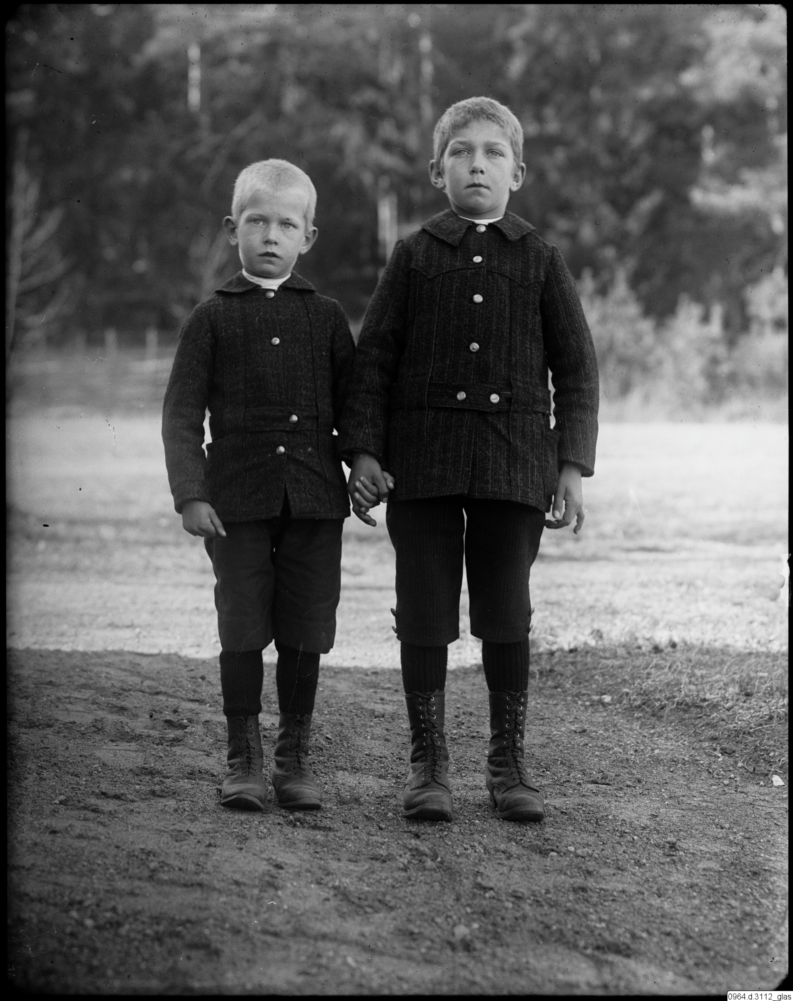 Två pojkar i jackor, knickers och kängor.