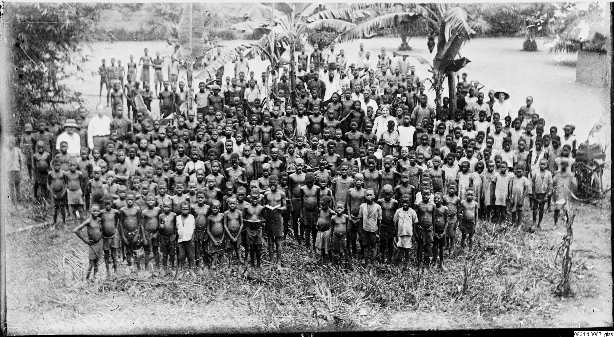 barn, gruppbild, missionärer, hydda, bananträd, fotografi, photograph