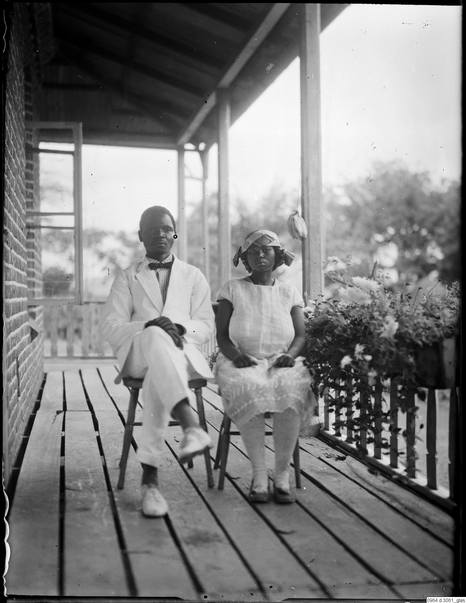 Par sittande på stolar på veranda, brudpar?