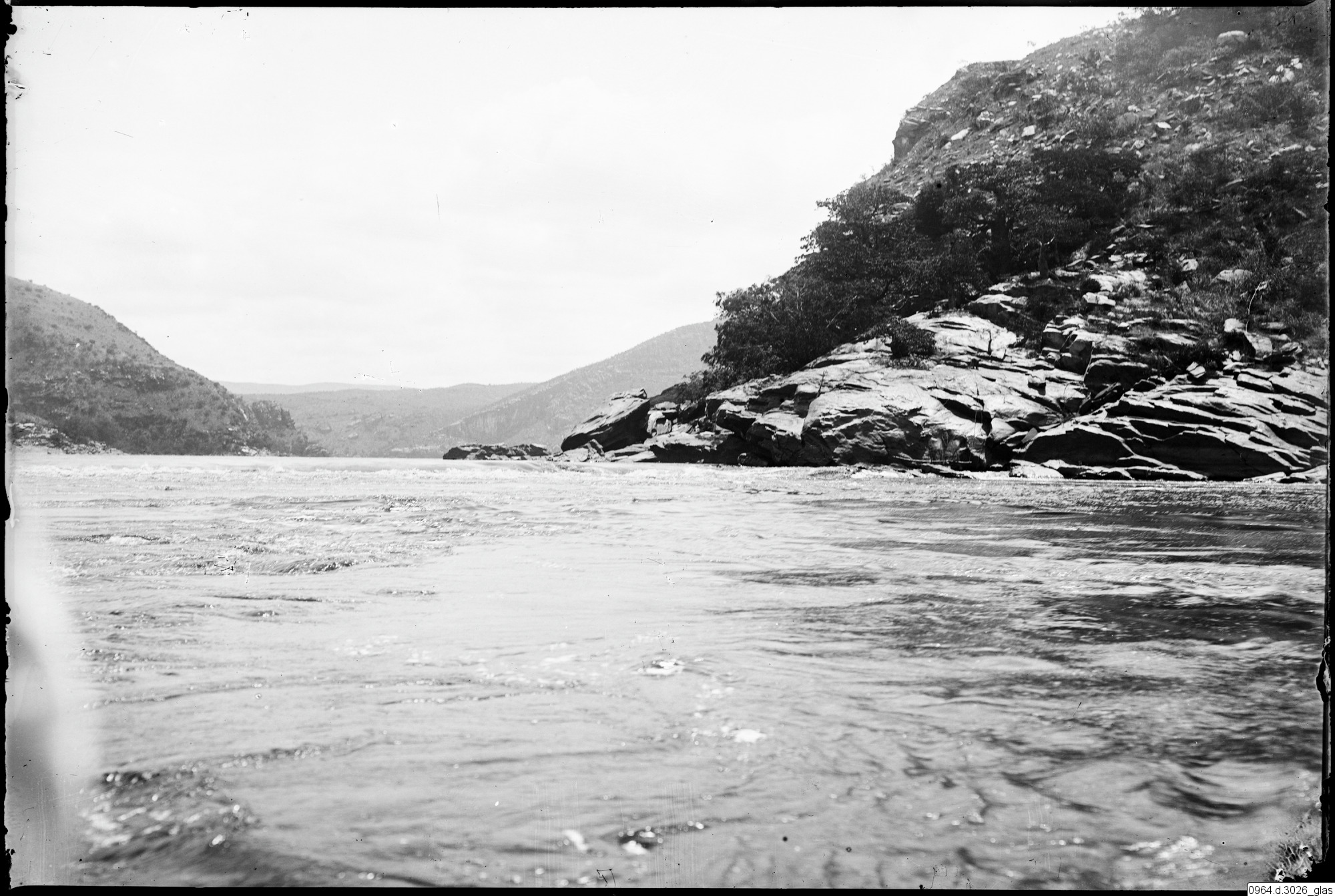 Flod som rinner genom klippigt landskap och berg i bakgrunden.
