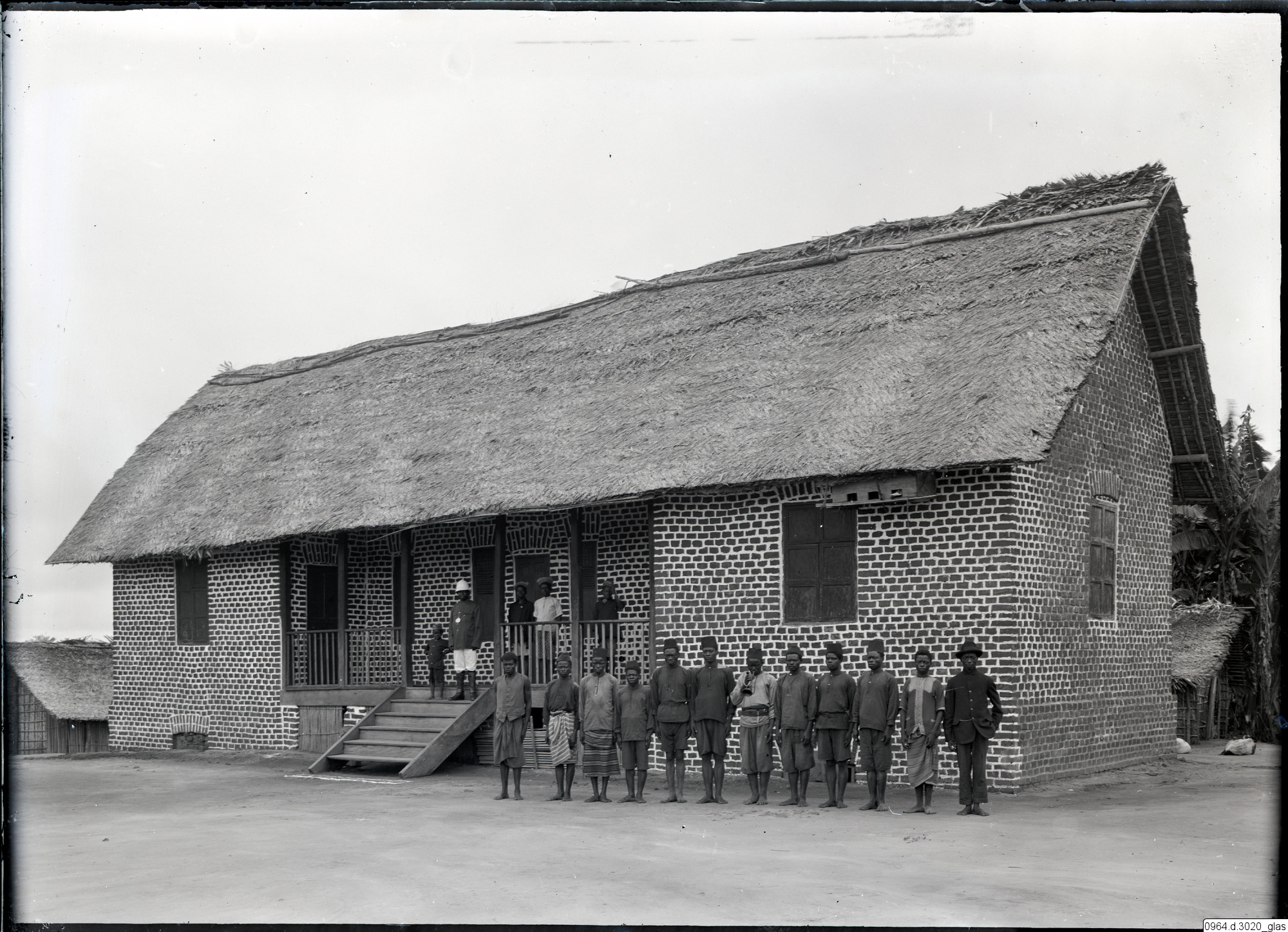 Man med medalj och hjälm på bron till en byggnad. En grupp soldater/poliser? uppställd framför byggnaden.