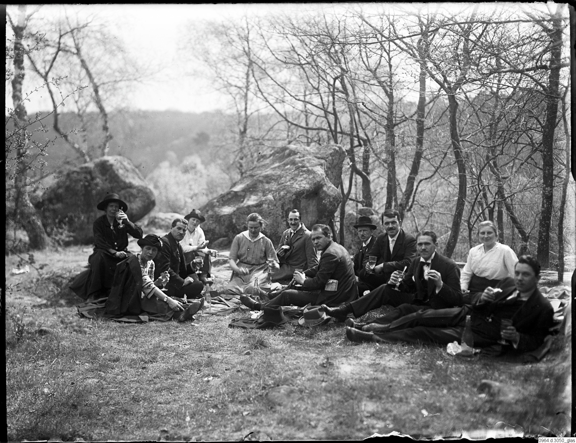 Gruppbild av utflykt i skogen, picknick. Södergrens sittande näst längst vänster. Sedan Sophie Larsson och Jernberg's.