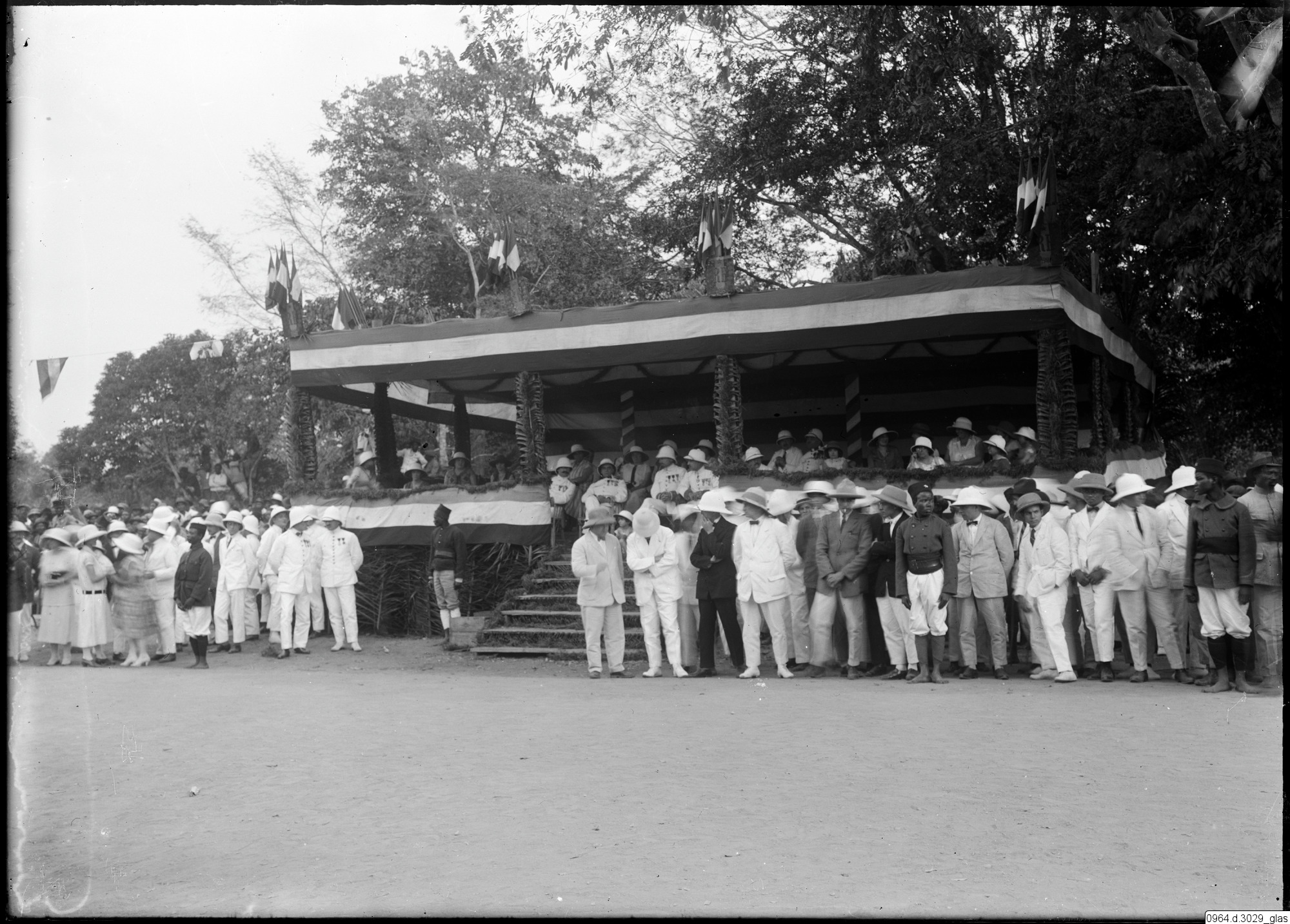 uniform, tropikhjälm, byggnad, gruppbild, flaggor, folksamling, fotografi, photograph