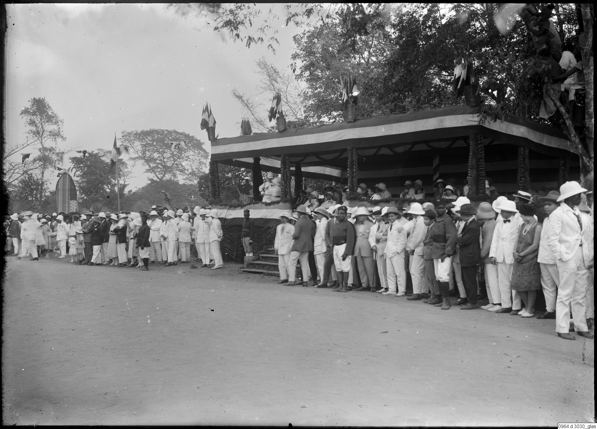 byggnad, gruppbild, väg, uniform, tropikhjälm, flaggor, fotografi, photograph