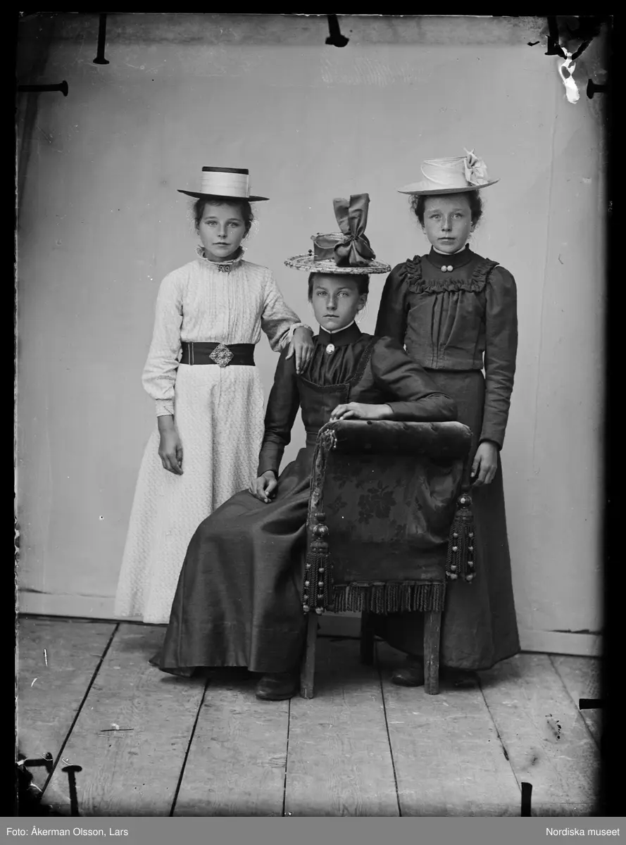Systrarna Anna och Josefina Larsson tillsammans med Anna Persson, alla från Husom. Bilden är med all säkerhet tagen inför Josefinas förestående resa till Nordamerika i september samma år. Systern Anna emigrerade tre år senare.