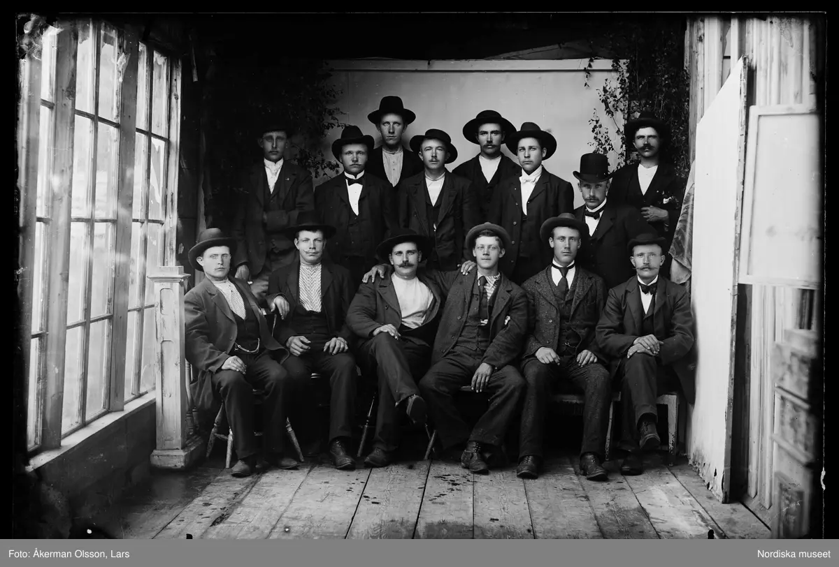 Titel: Midsommarfirande vägarbetare i ateljén. De byggde vägen mellan Lima och Rörbäcksnäs.