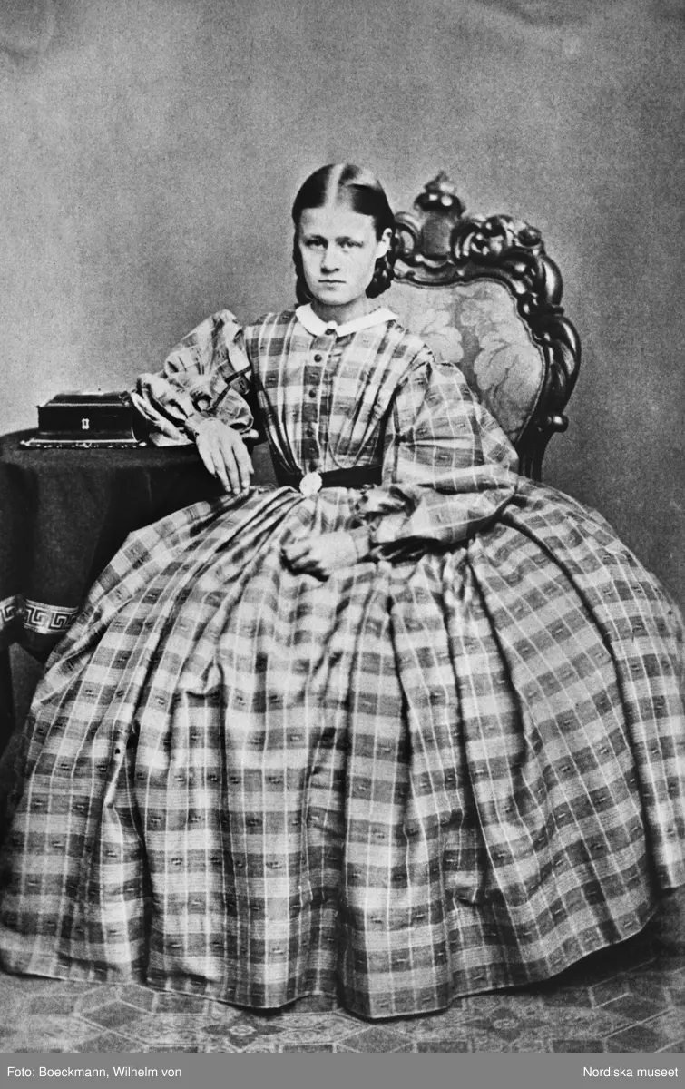 Porträtt av ung kvinna, Anna Carolina Östrand (född 1845) sittande vid bord iklädd rutig klänning, krinolin, med puffärmar och vit krage.