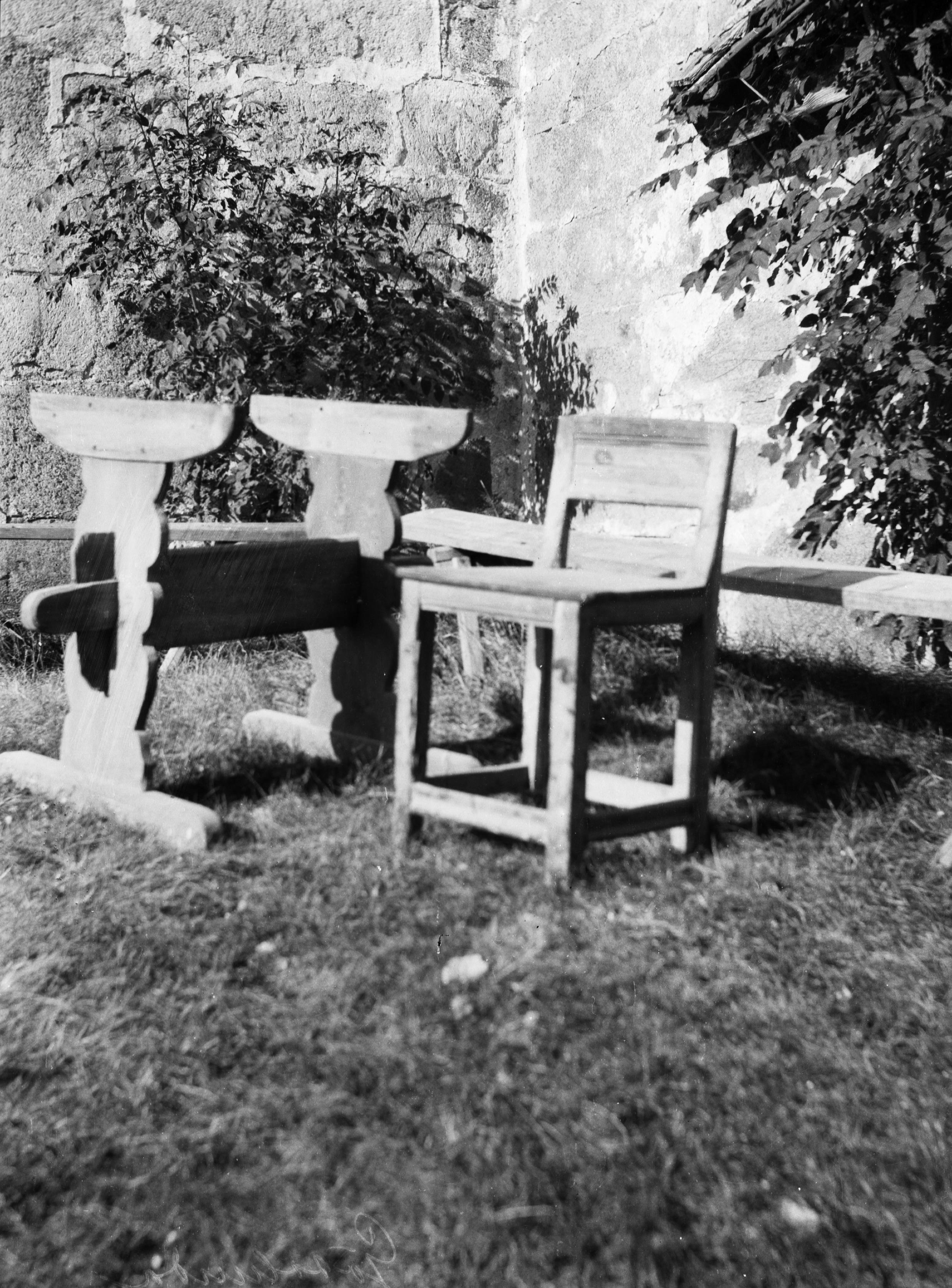 Stol, furu, 1600-tals typ, bord, medeltida typ.