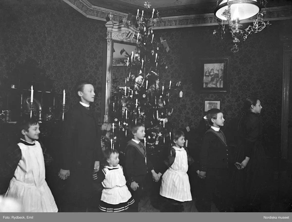 Barn dansar kring den klädda julgranen i ett rum.