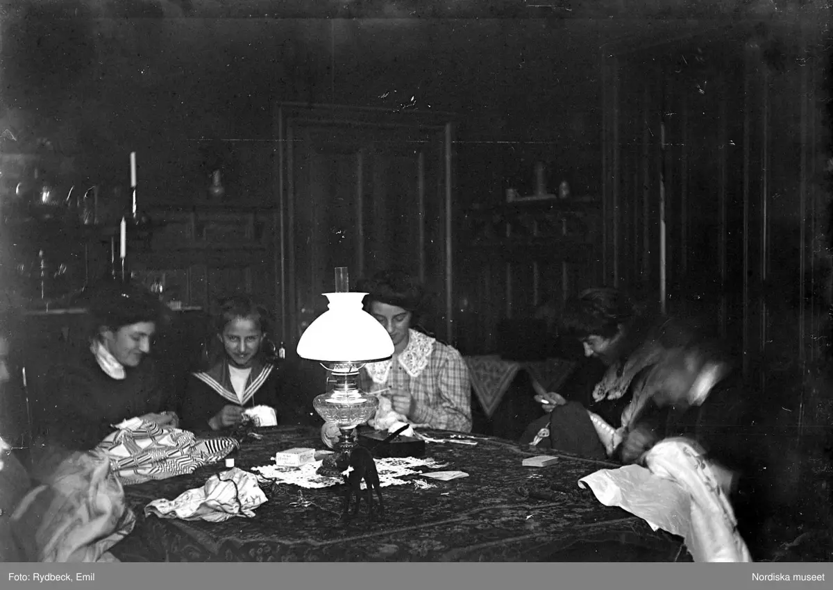 Frökn. Karin och Margit Palmgren, Olga Stäfberg samt Sigrid, Anna och Carin Rydbeck handarbetar kring bordet, upplyst av fotogenlampa.