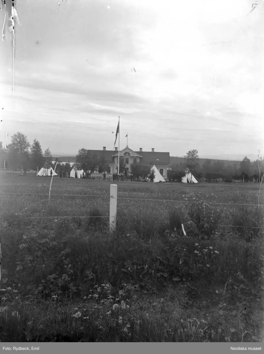 En stor trävilla i ett kulturlandskap. Vita tält på gården framför huset.