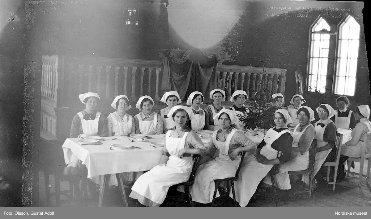 Gruppbild. Elever vid hushållsskola vid dukat bord med en granar på bordet, från början av 1900-talet.