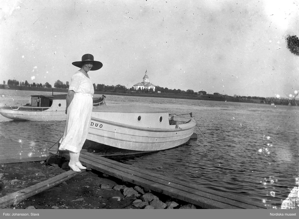 Kvinna klädd i vit sommarklänning och mörk bredbrättad hatt står vid Torne älv med Nedertorneå kyrka (även kallad Björkö kyrka) på den finska sidan älven. Järnvägsbron mellan Haparanda och Finland skymtar th i bakgrunden. Två båtar förtöjda vid brygga.