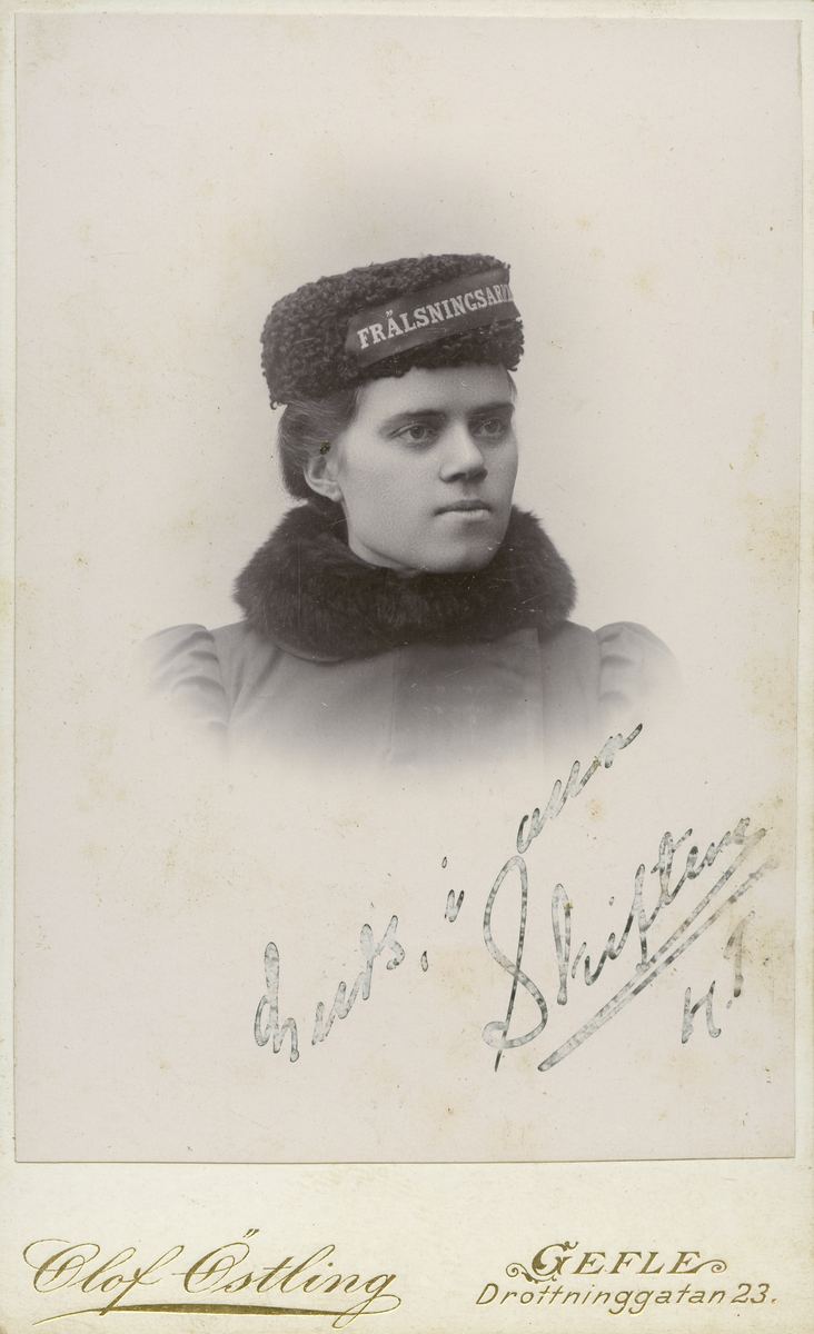 Porträtt av frälsningssoldat. Text på framsida kort: "Guds i alla skiften?" Text baksida kort: "Kämpa den goda kampen".