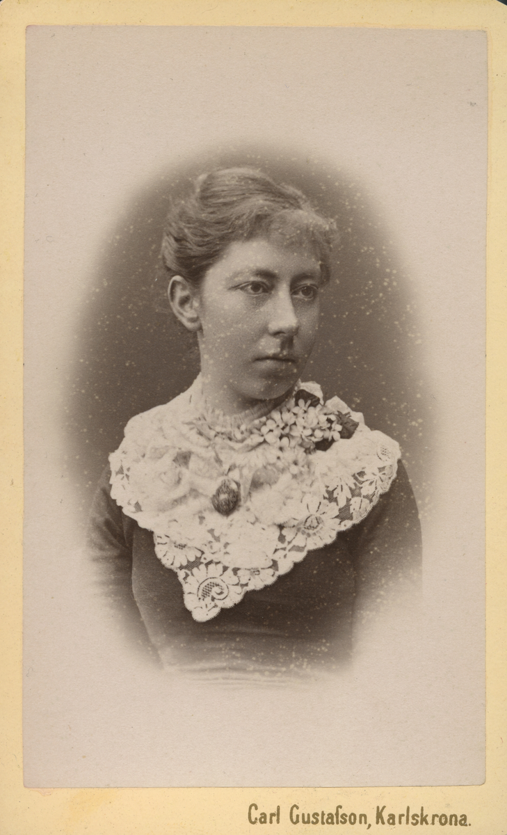 Kvinnoporträtt. Text baksida kort: "Moa många hälsningar till Maria från hennes tillgivna spelkamrat".