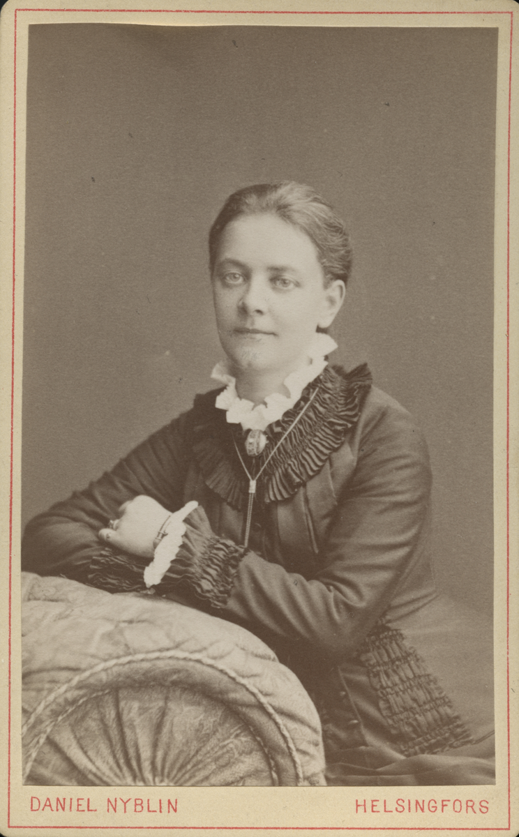 Porträtt av Thérése? Hiort af Ornäs. Text baksida kort: "Till Marie Sophia Thomée med hjertl. hlsn. Från Thérése Hiort af Ornäs", fotogr. 1882.