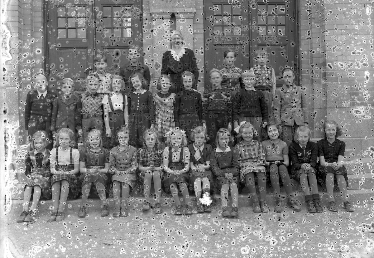 Foto av en skolklass med lärarinna, som samlats utanför skolans port.