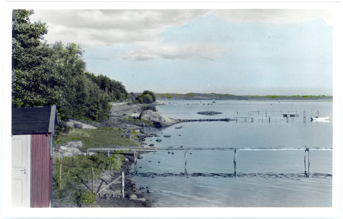 Handkoloreratvykort som avbildar landskap vid havet; bryggor sträcker sig ut i havet, med berg i motivets bakgrund.
