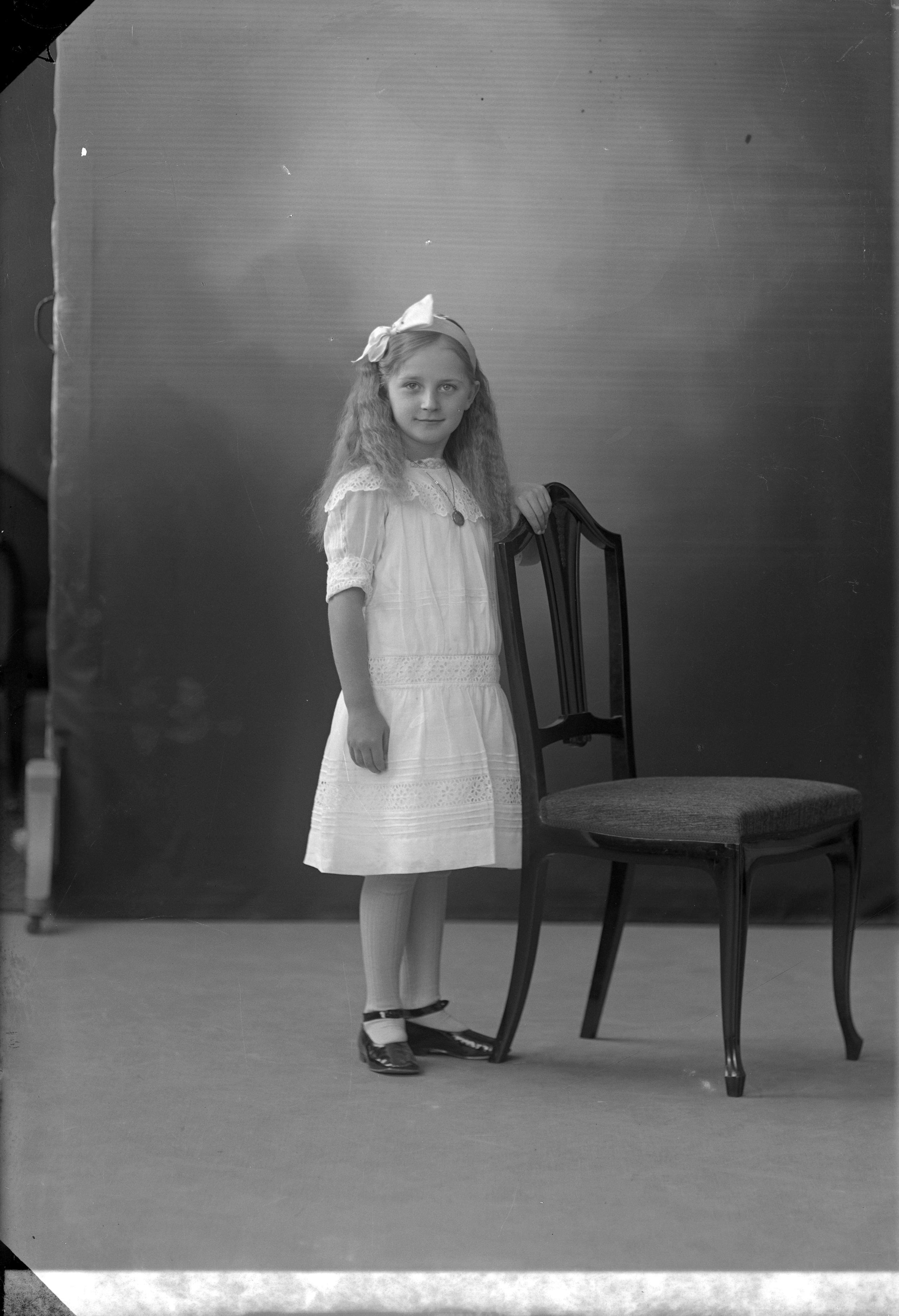 Beskrivning: Porträtt i helfigur av Blomströms dotter stående vid stol.