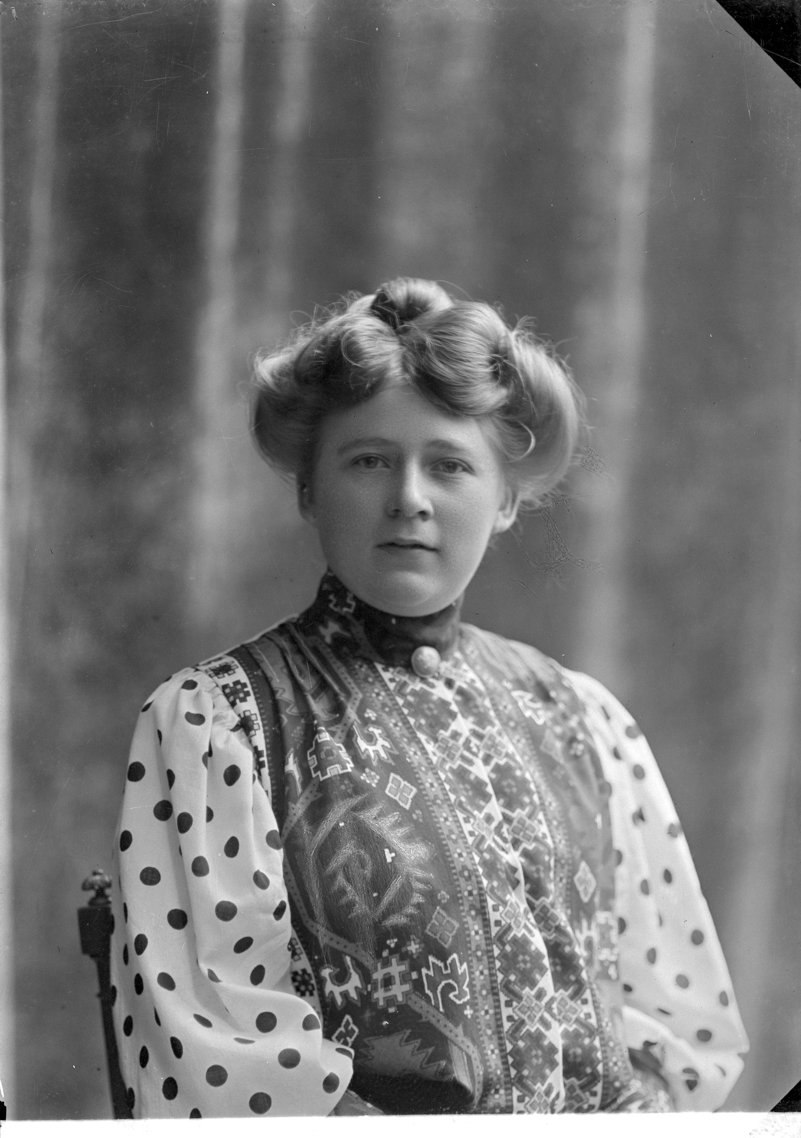 Beskrivning: Porträtt i halvfigur av oidentifierbar kvinna.