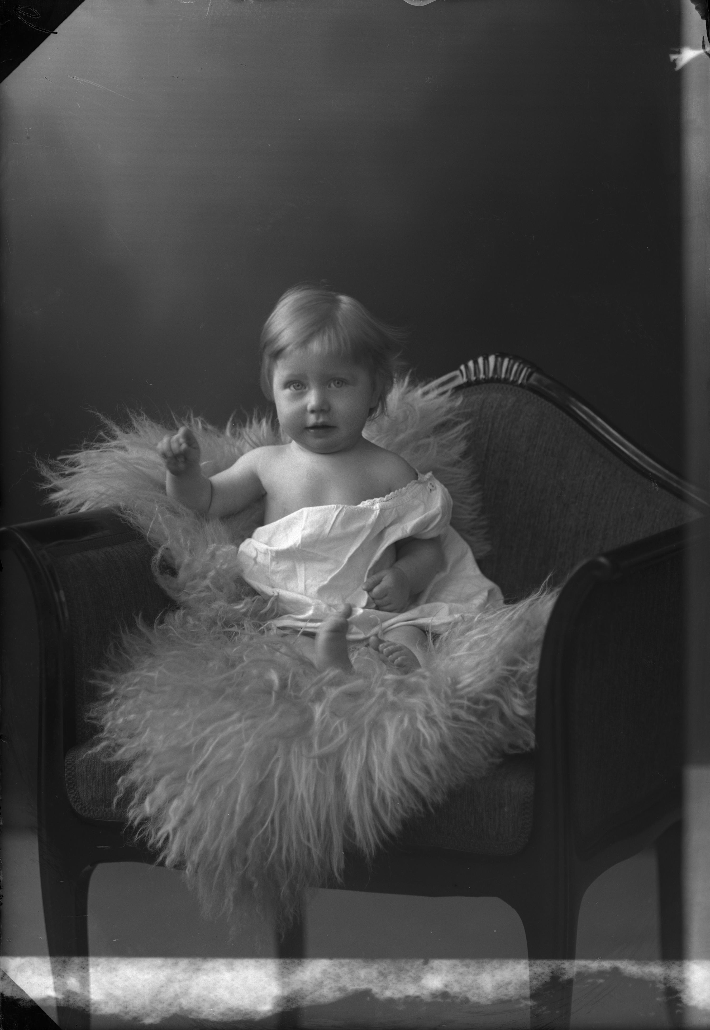 Porträtt i halvfigur av Brorssons barn sittande på fäll, lagd på stol.