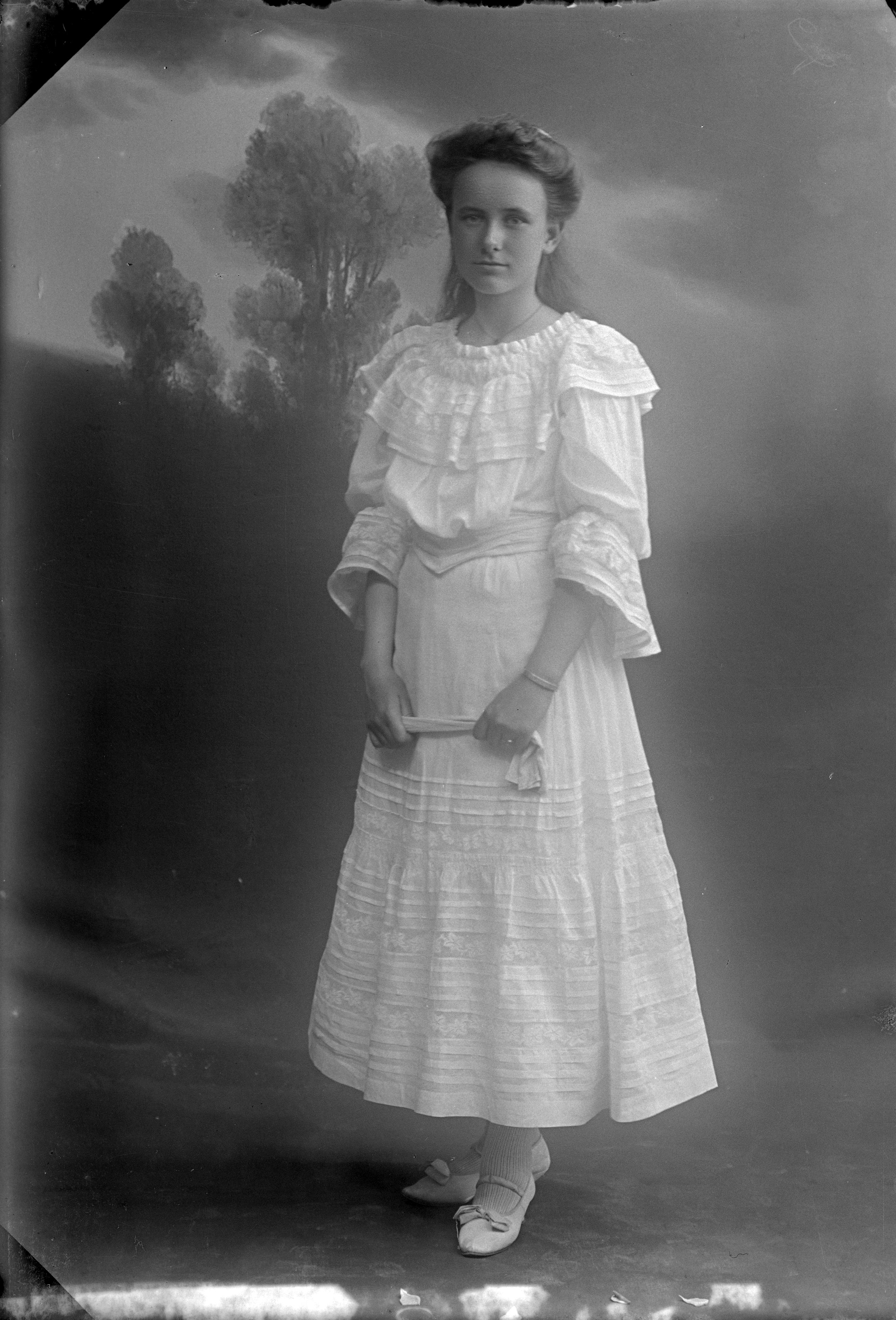 Beskrivning: Porträtt i helfigur av Stina (efternamn saknas) stående invid ateljéfond.