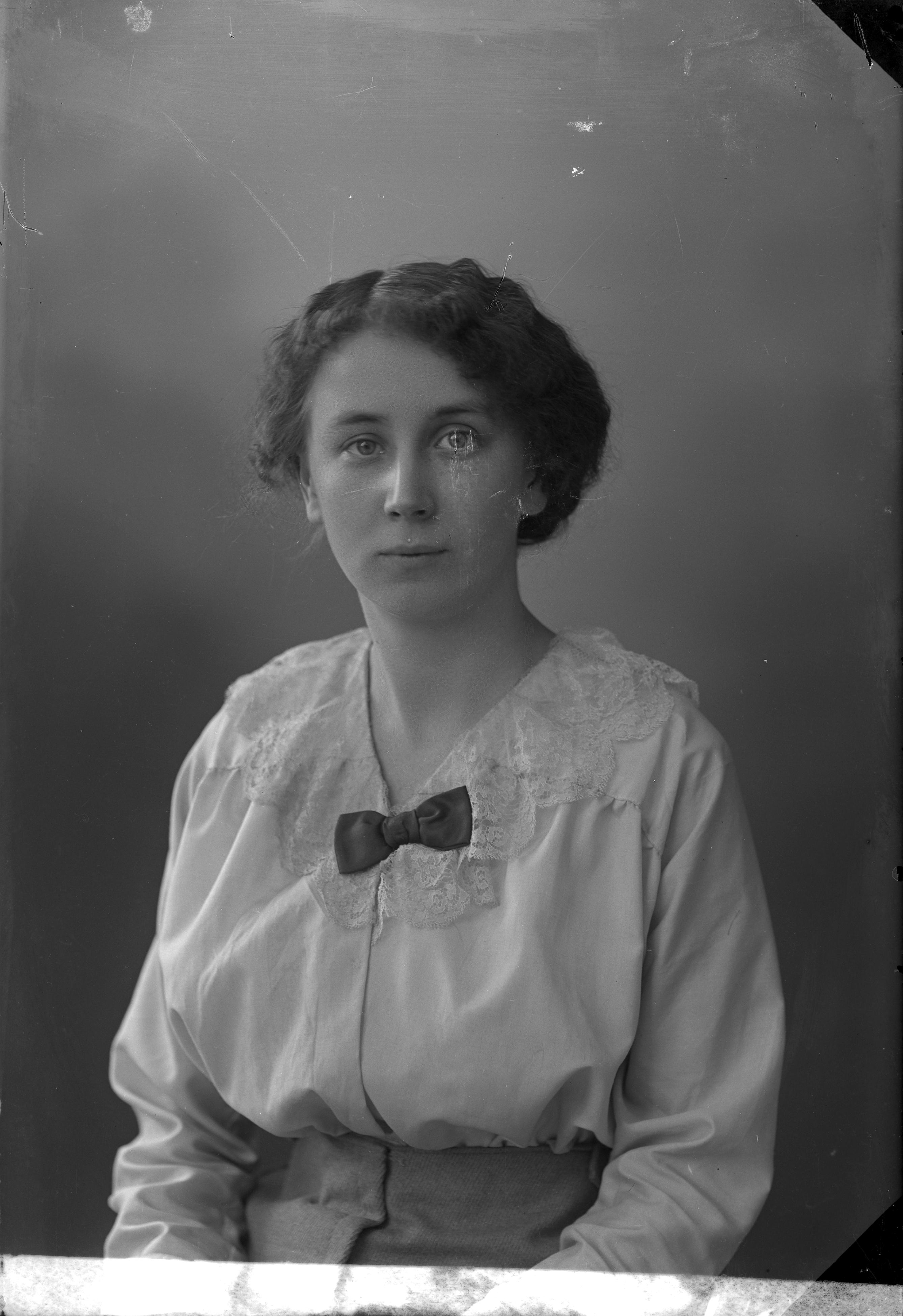 Beskrivning: Porträtt i halvfigur av Maja Larsson med rosett vid bluskragen.