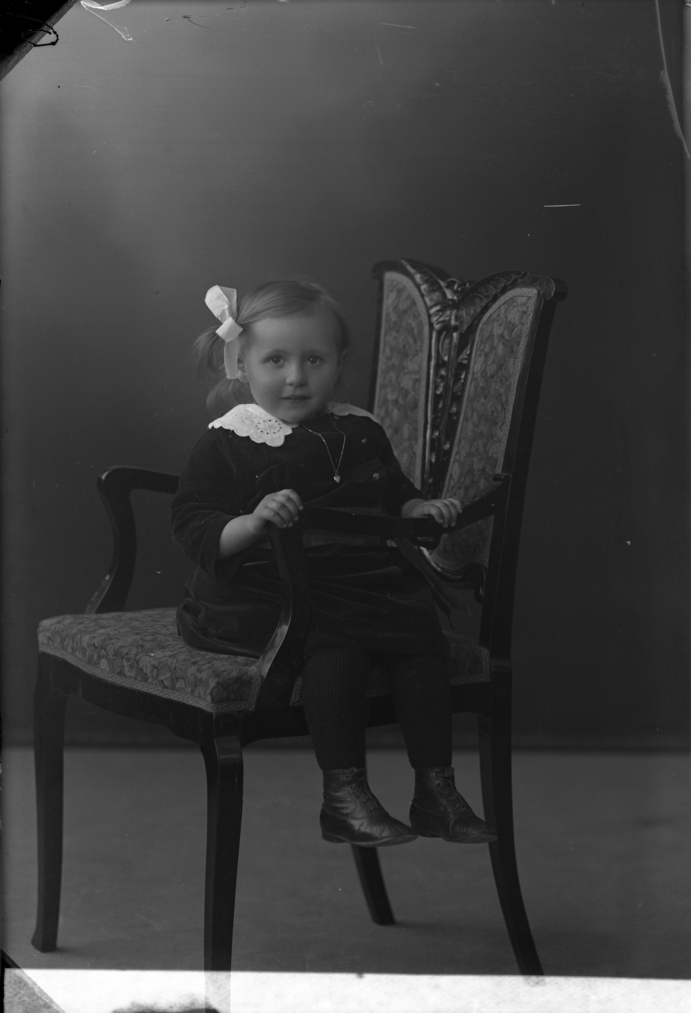 Beskrivning: Porträtt i halvfigur av Borgströms dotter sittande på stol.