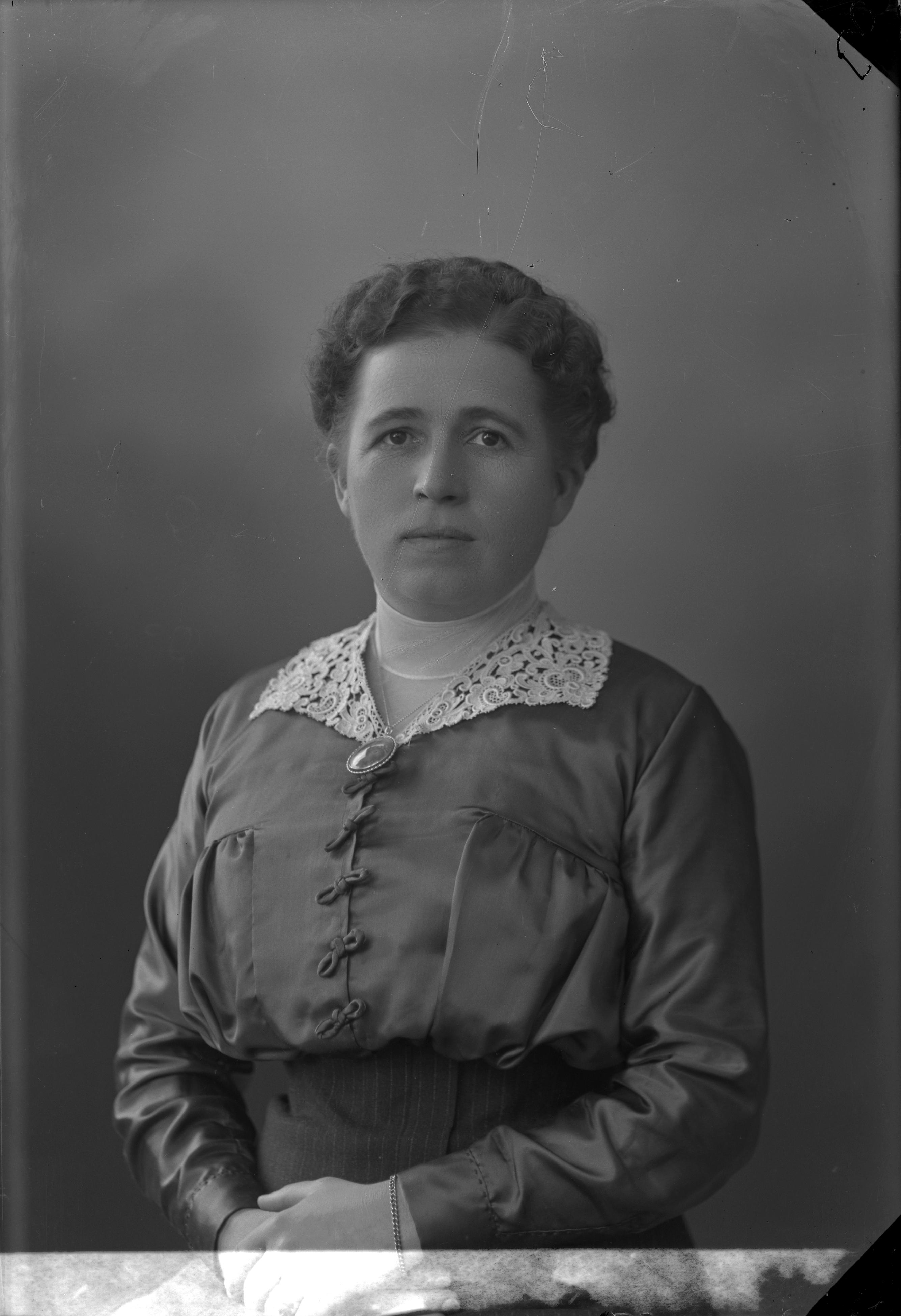 Beskrivning: Porträtt i halvfigur av fru Cavalli i blus med spetskrage.