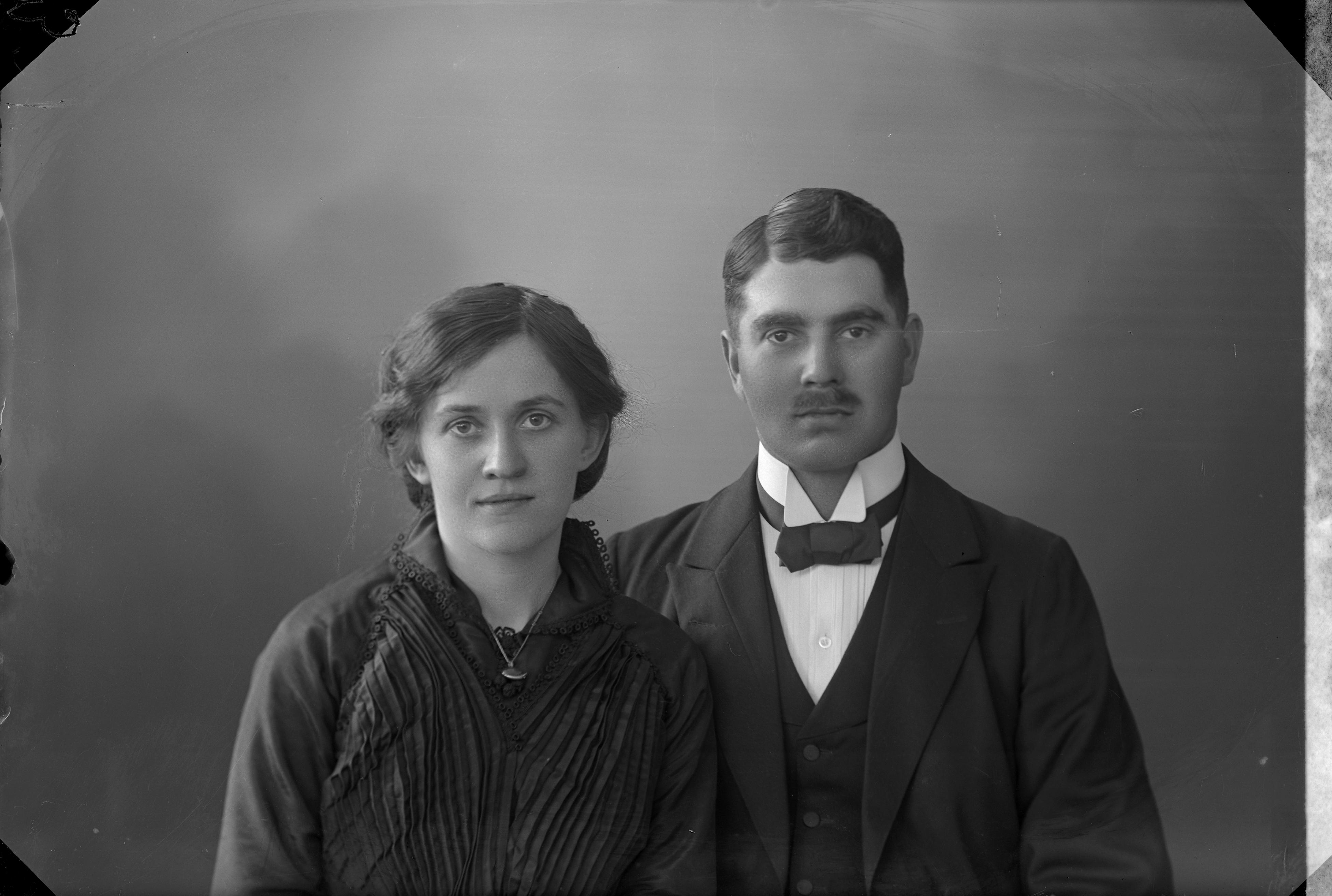 Beskrivning: Porträtt i halvfigur av V. Larsson med fru.