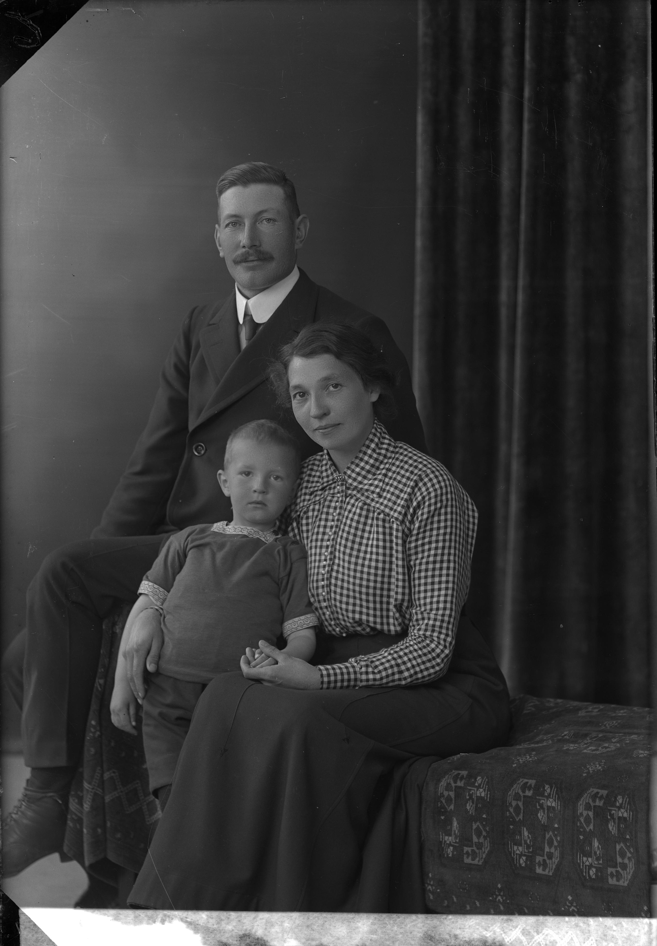 Beskrivning: Porträtt i helfigur av Gustaf Sverin med fru och son.