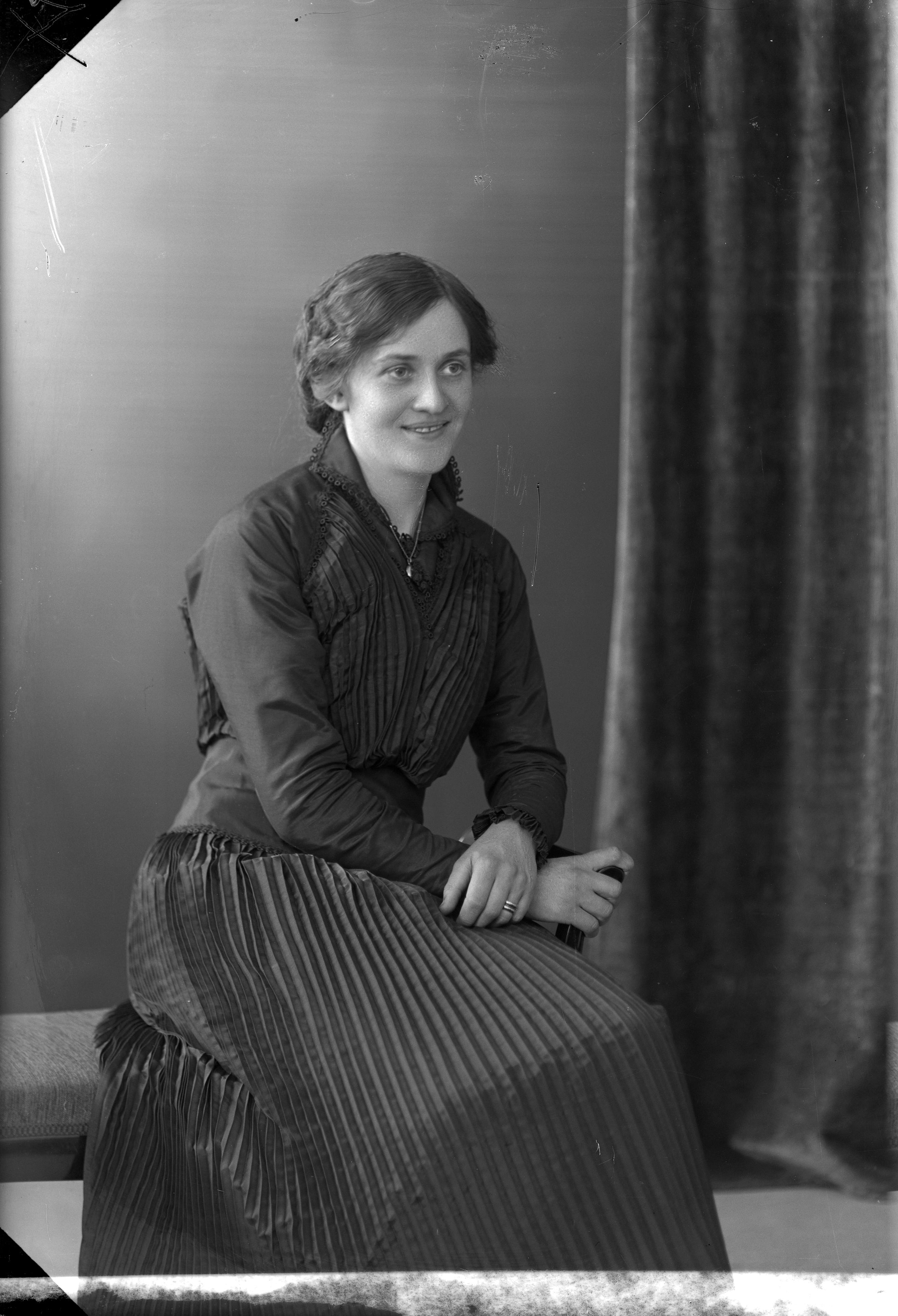 Beskrivning: Porträtt i helfigur av fru Larsson.