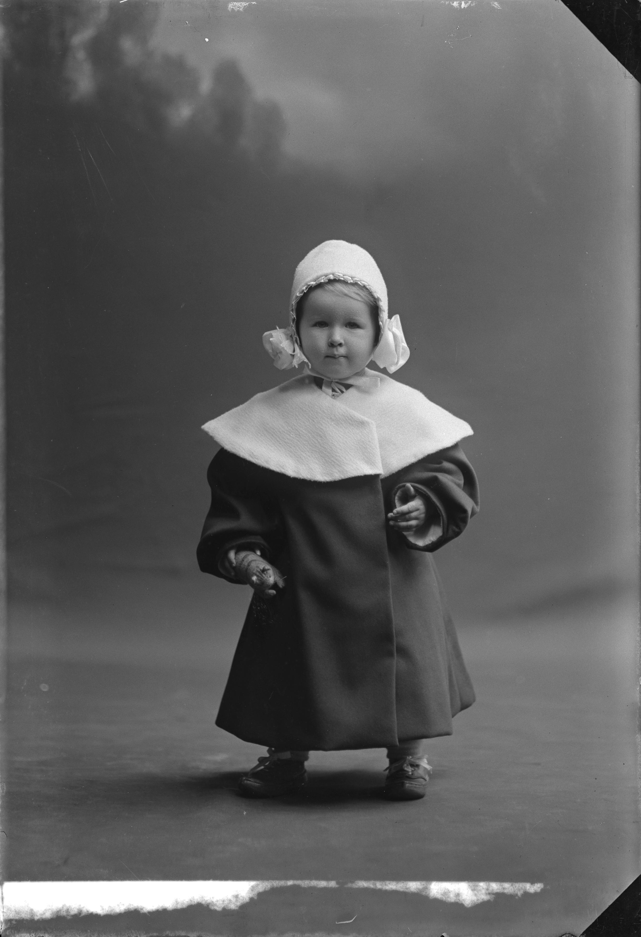 Porträtt i helfigur av Sandgrens dotter i hätta och ytterkläder.