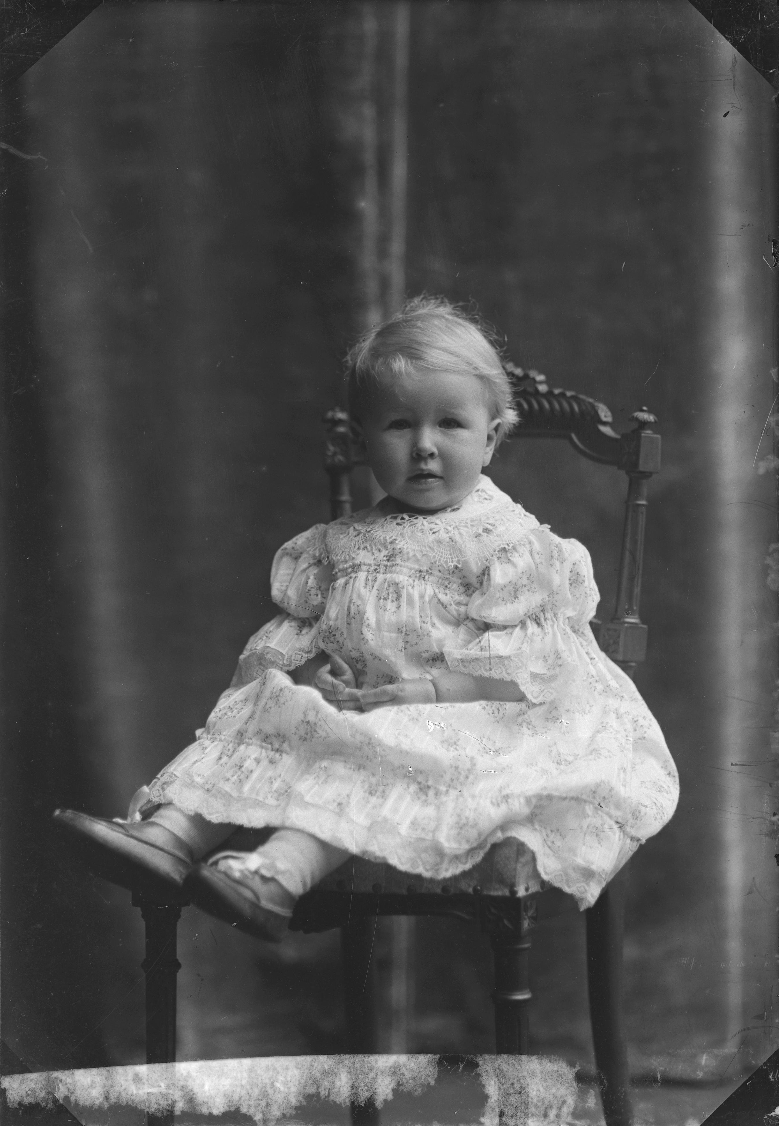 Porträtt i helfigur av Sandgrens dotter, sittande på stol.