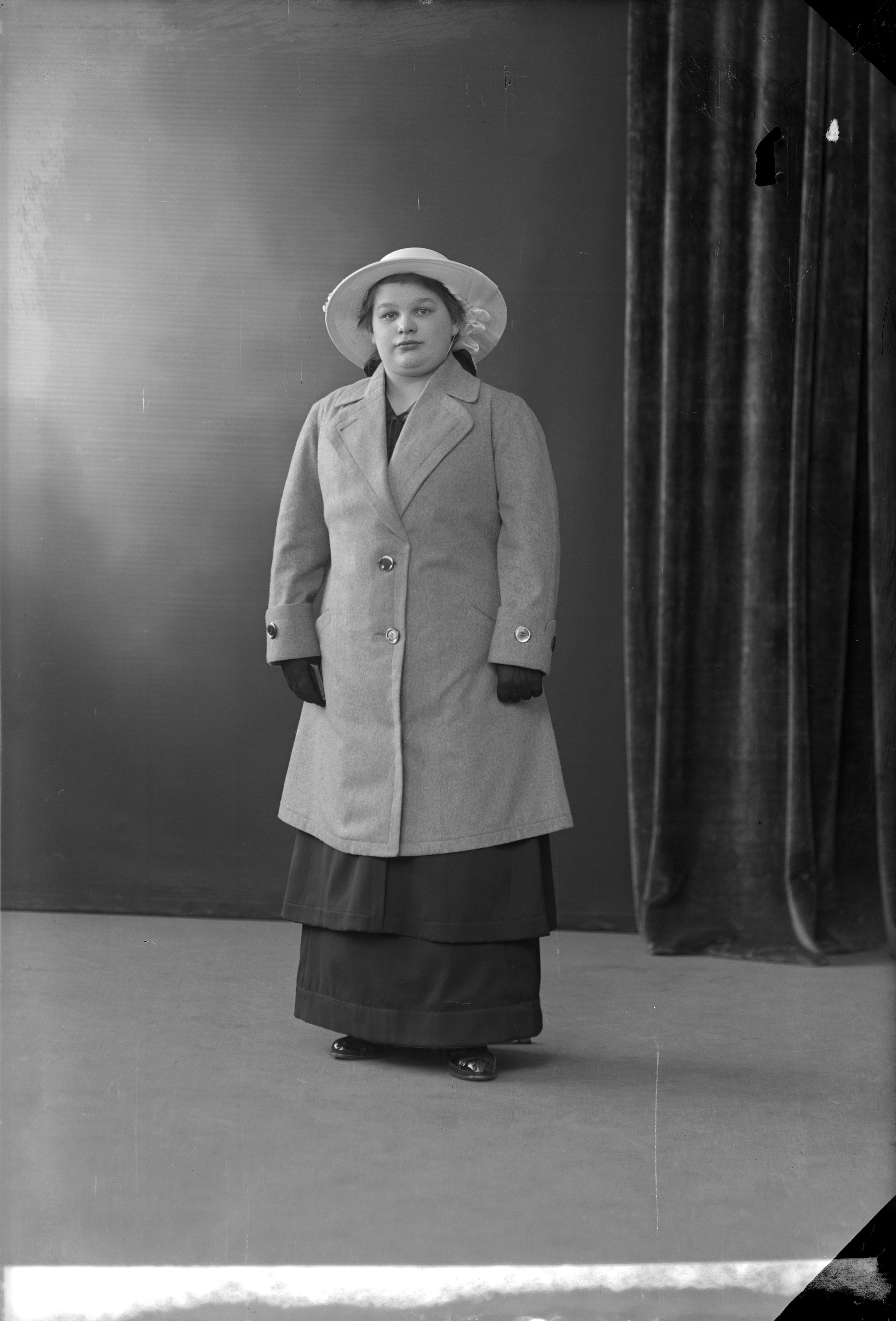 Porträtt i helfigur av Iris Tidlund i hatt och kappa.