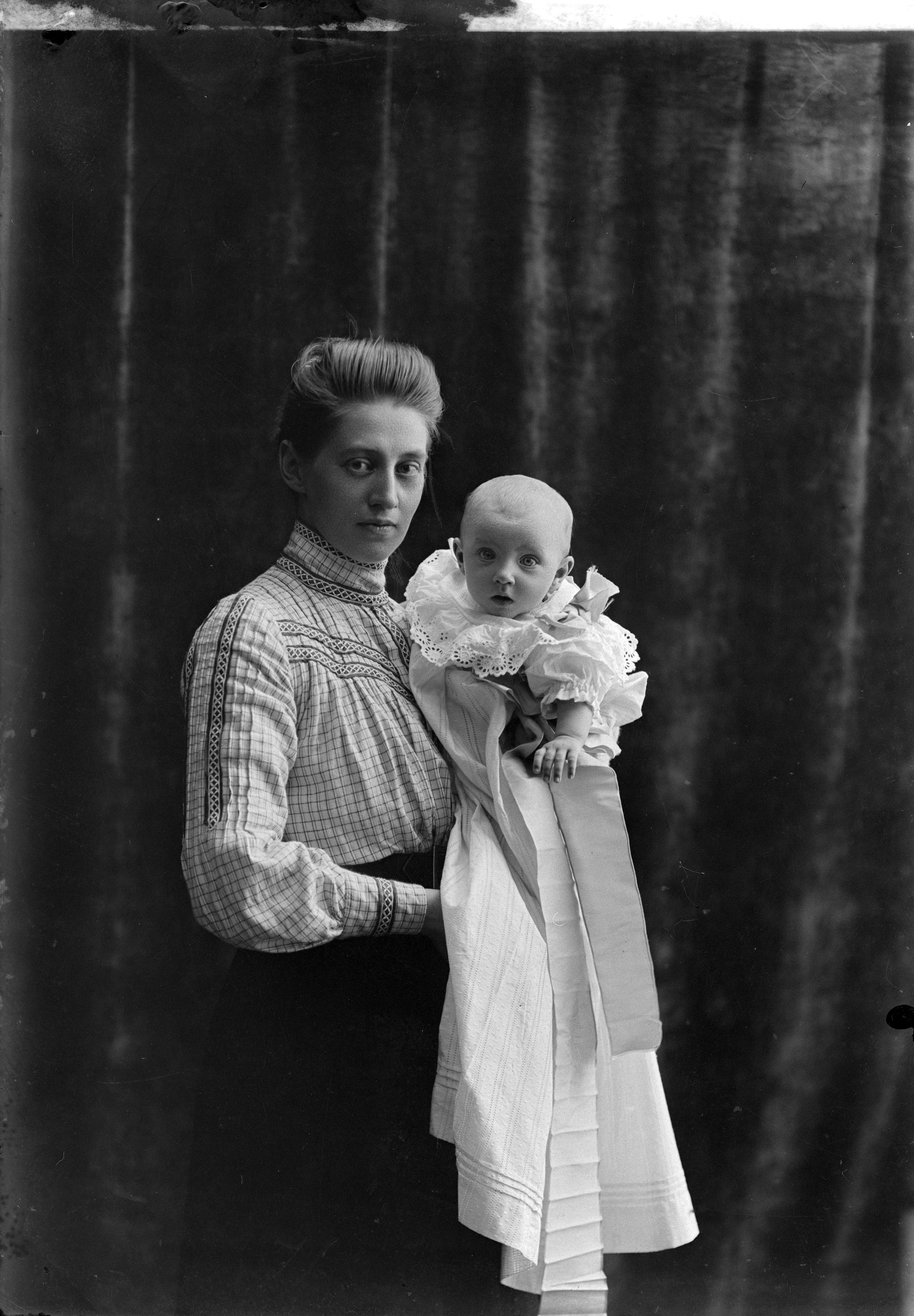 Porträtt i hwlfigur av Johanna Olsberg, hållande sitt barn i famnen. Barnet i dopklänning.