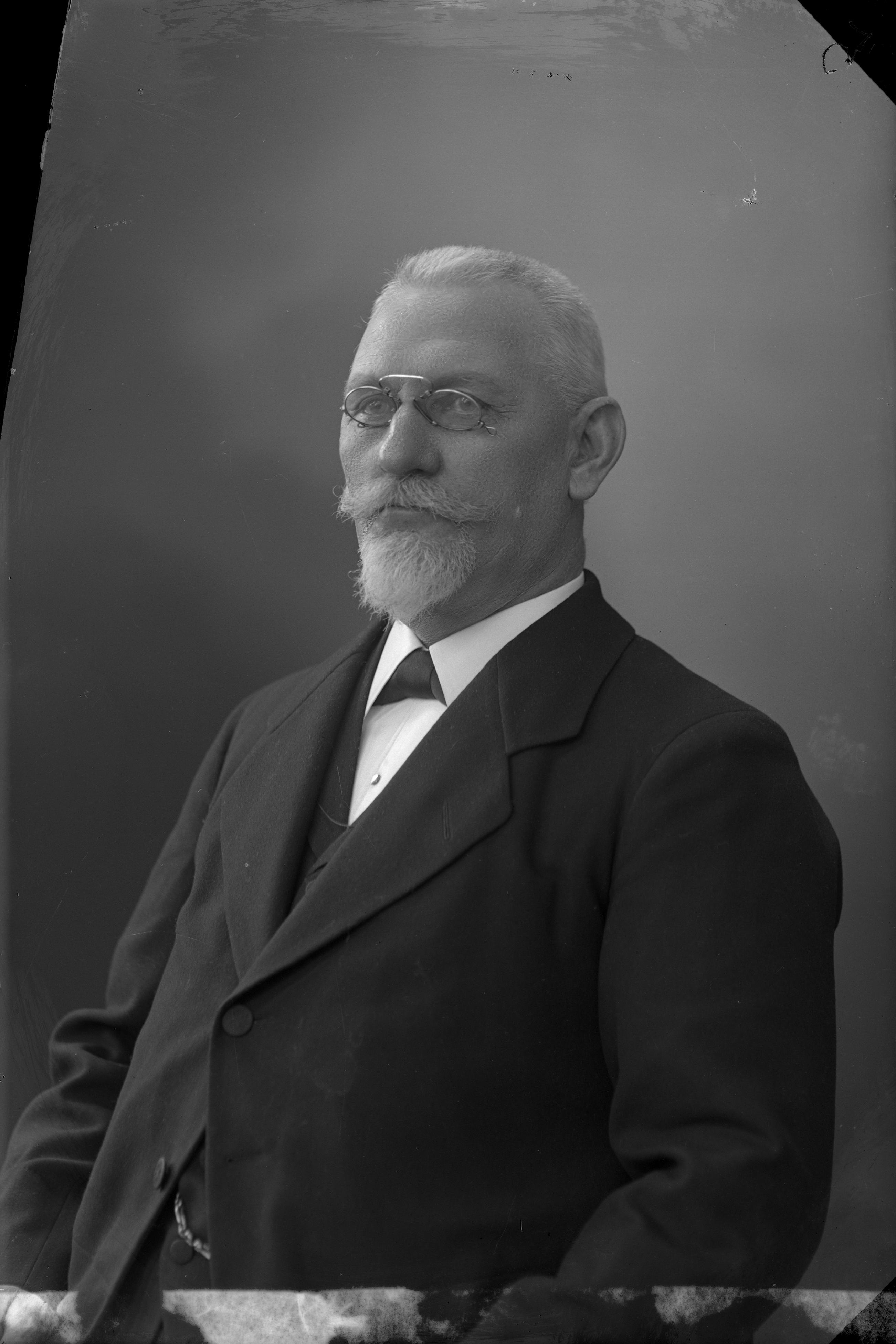 Beskrivning: Porträtt i halvfigur av byggmästare Per Dahlgren.