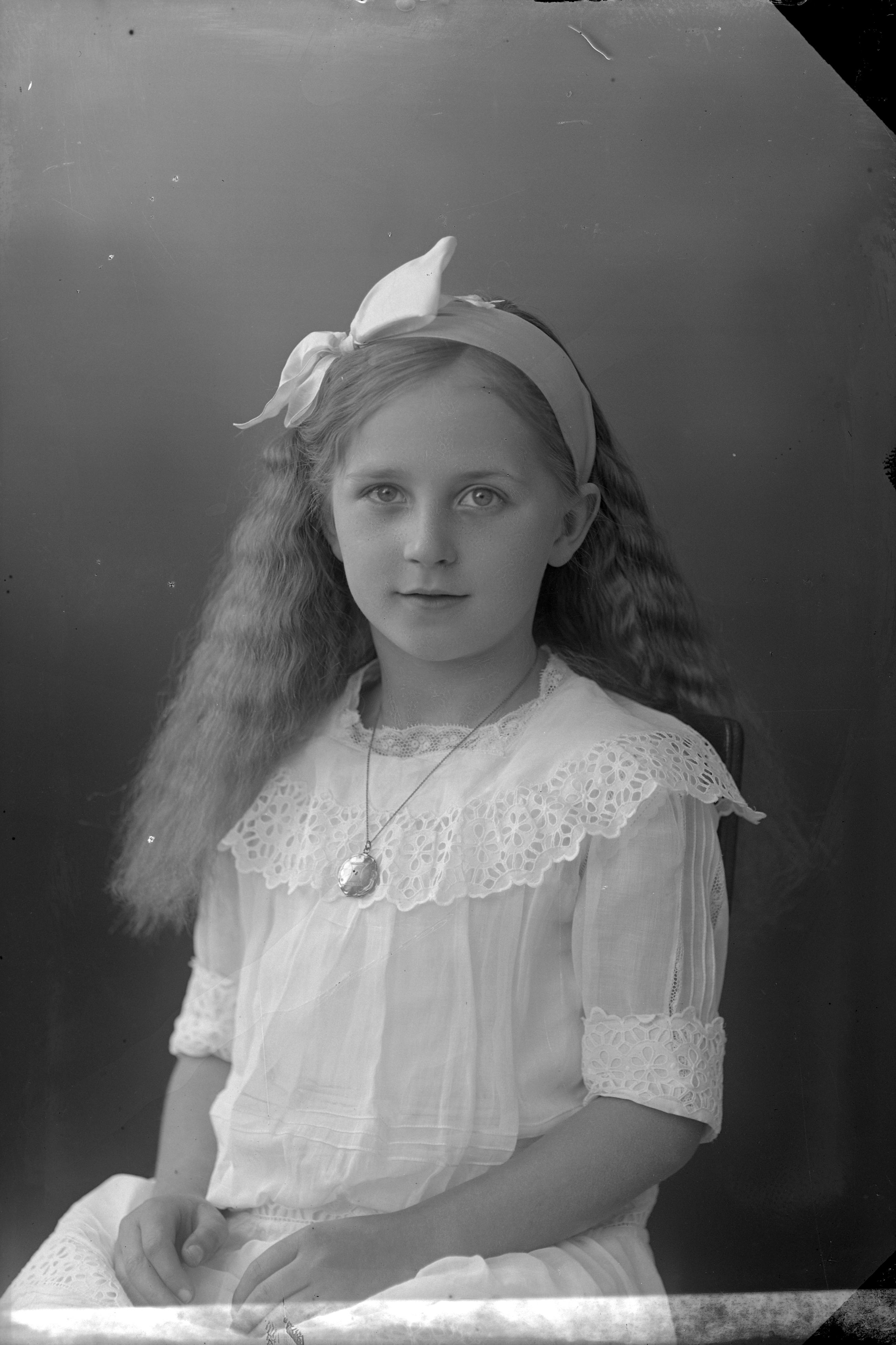 Beskrivning: Porträtt i halvfigur av Blomströms dotter bärande hårband med rosett.
