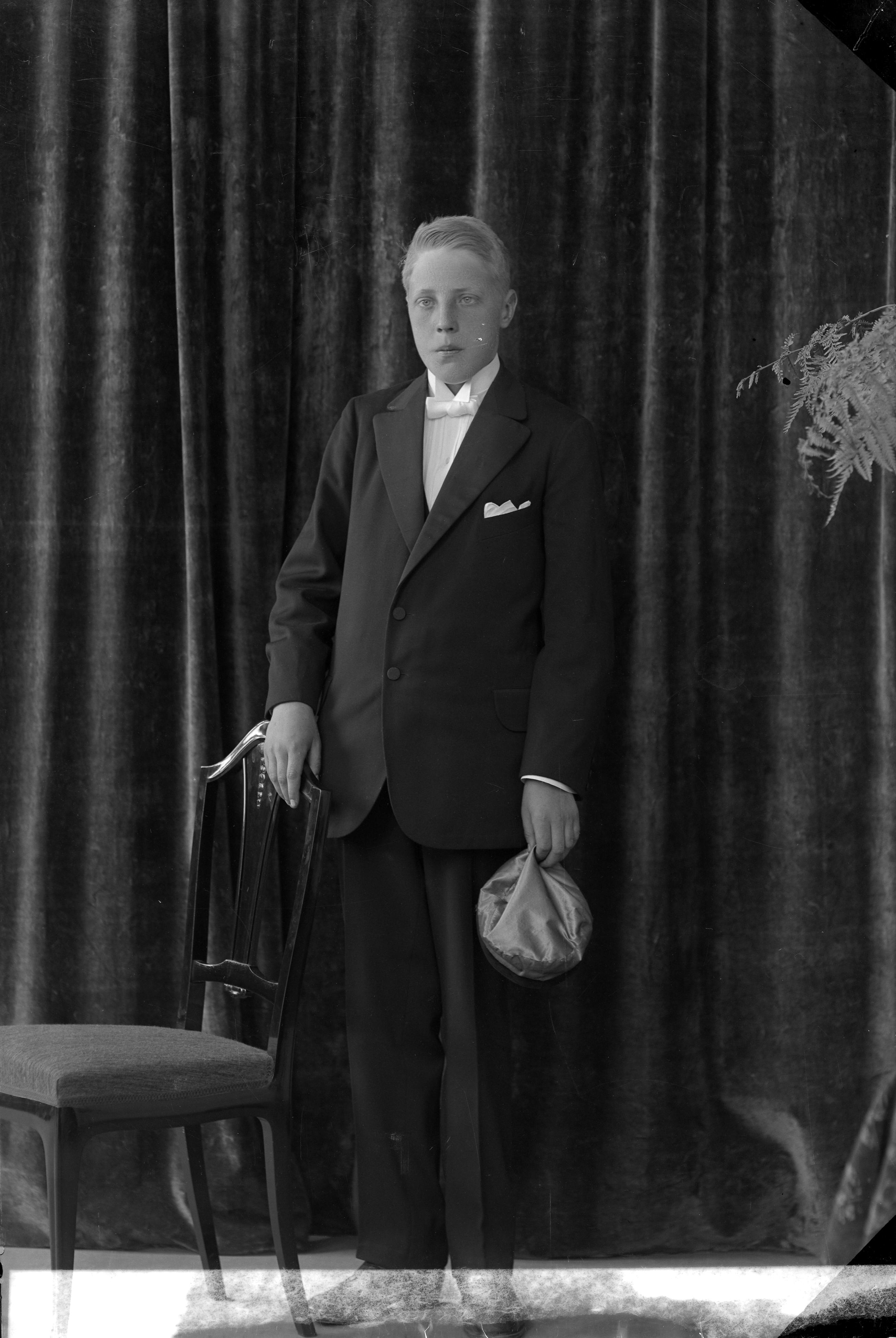 Porträtt i helfigur av Artur Andersson, stående vid stol, hållande studentmössa.
