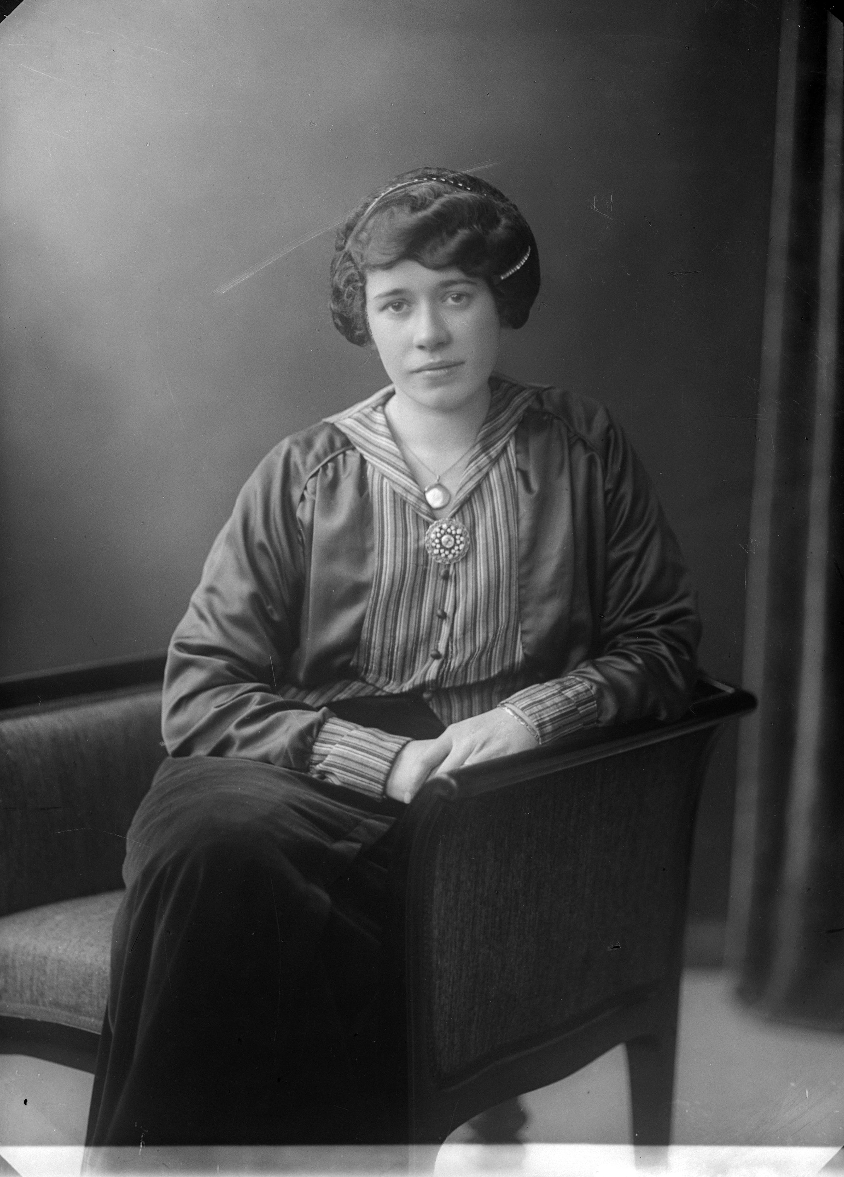 Porträtt i helfigur av Olga Sjögren, sittande i stol.