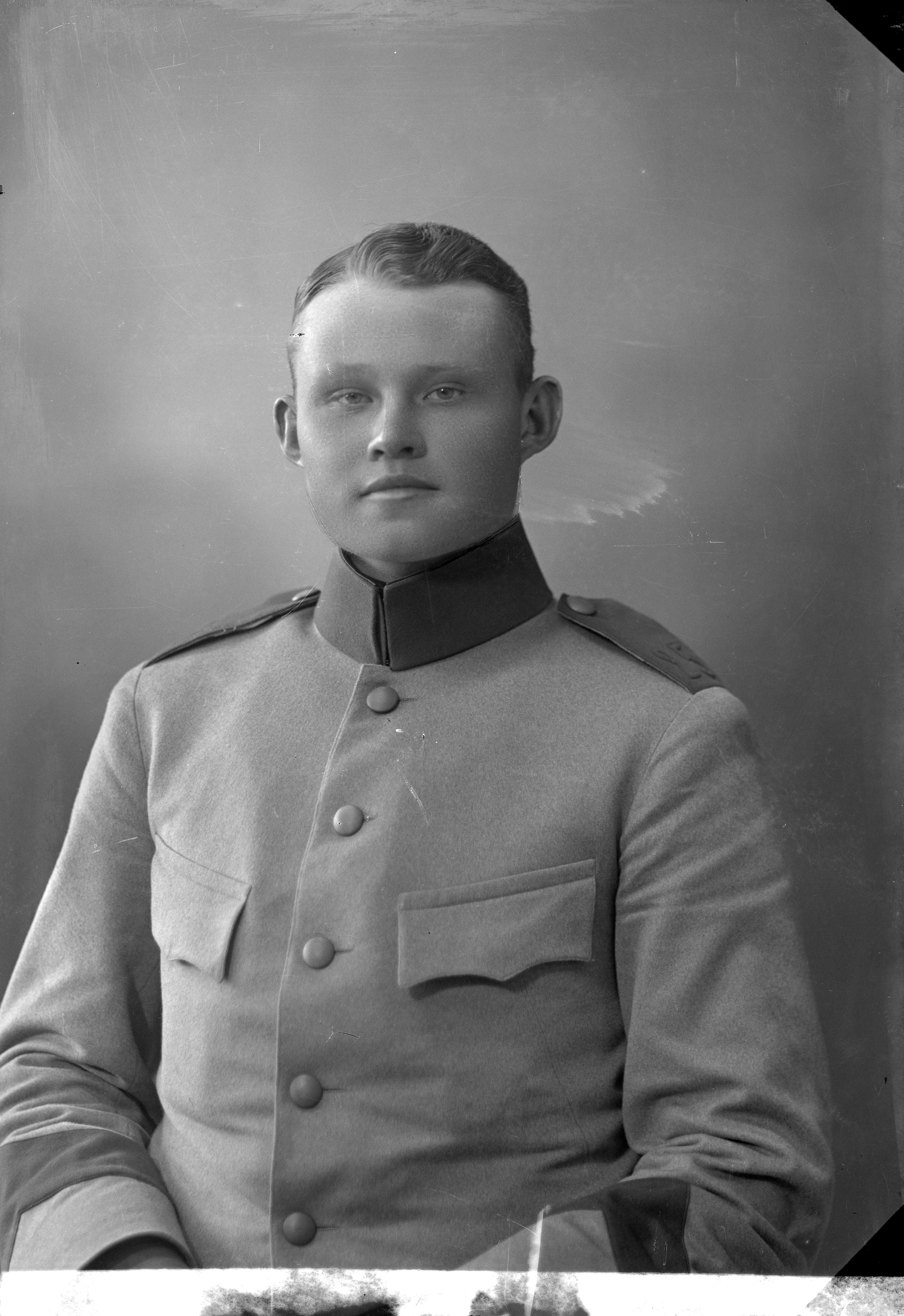 Beskrivning: Porträtt i halvfigur av Albin Jakobsson i militäruniform.
