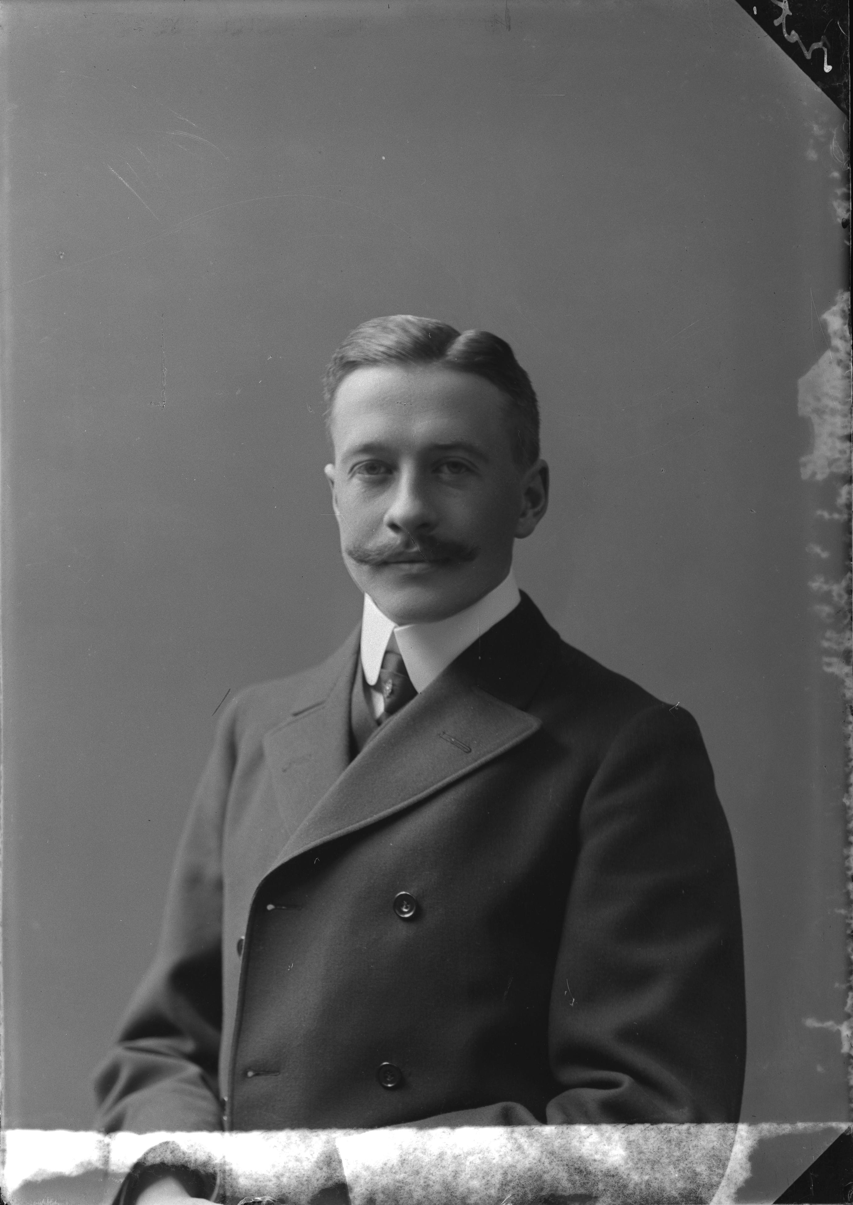 Beskrivning: Porträtt i halvfigur av barberare Bror Holmgren.