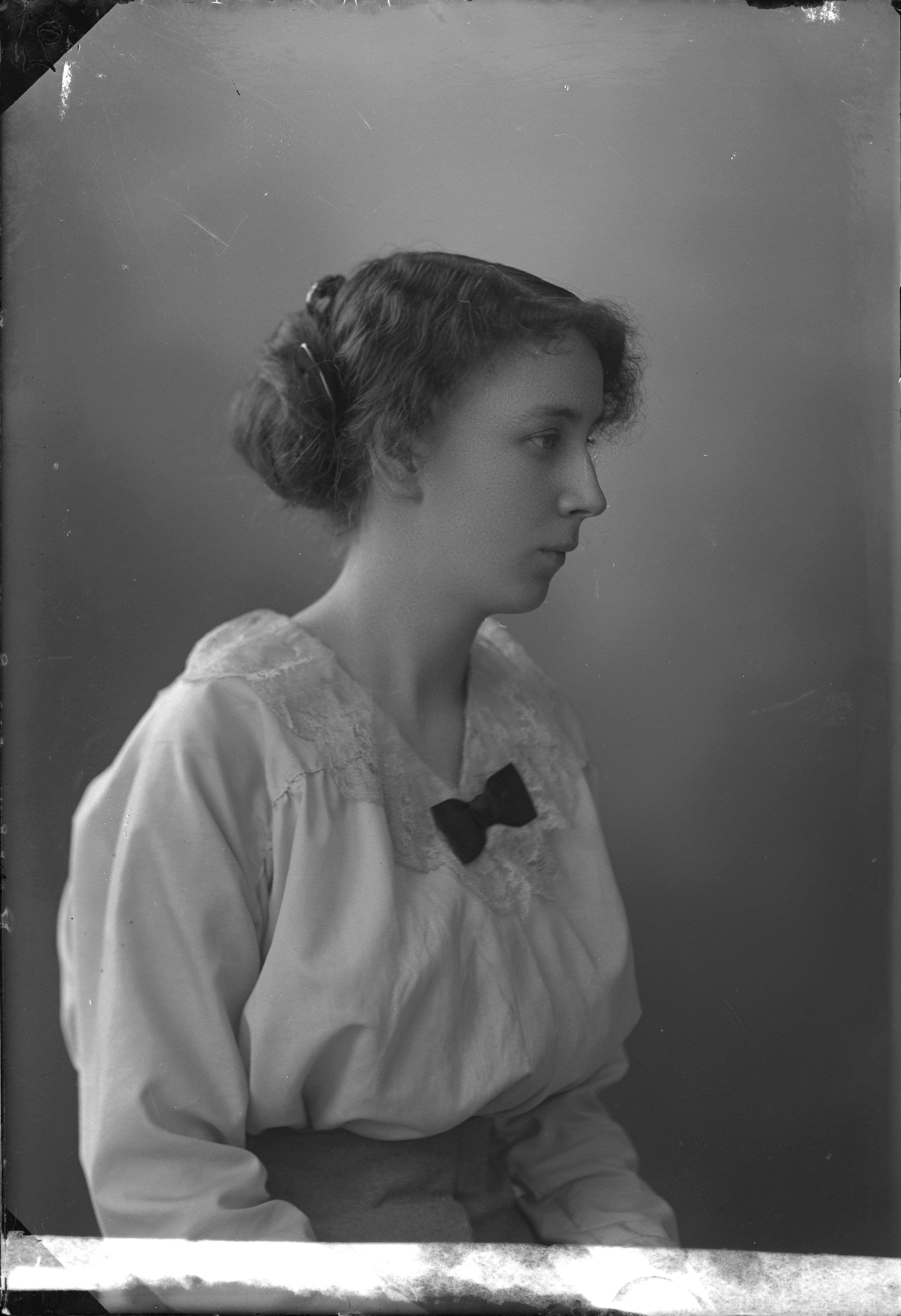 Porträtt i halvfigur av Maja Larsson, ansikte i profil. Hon bär en rosett på bluskragen.